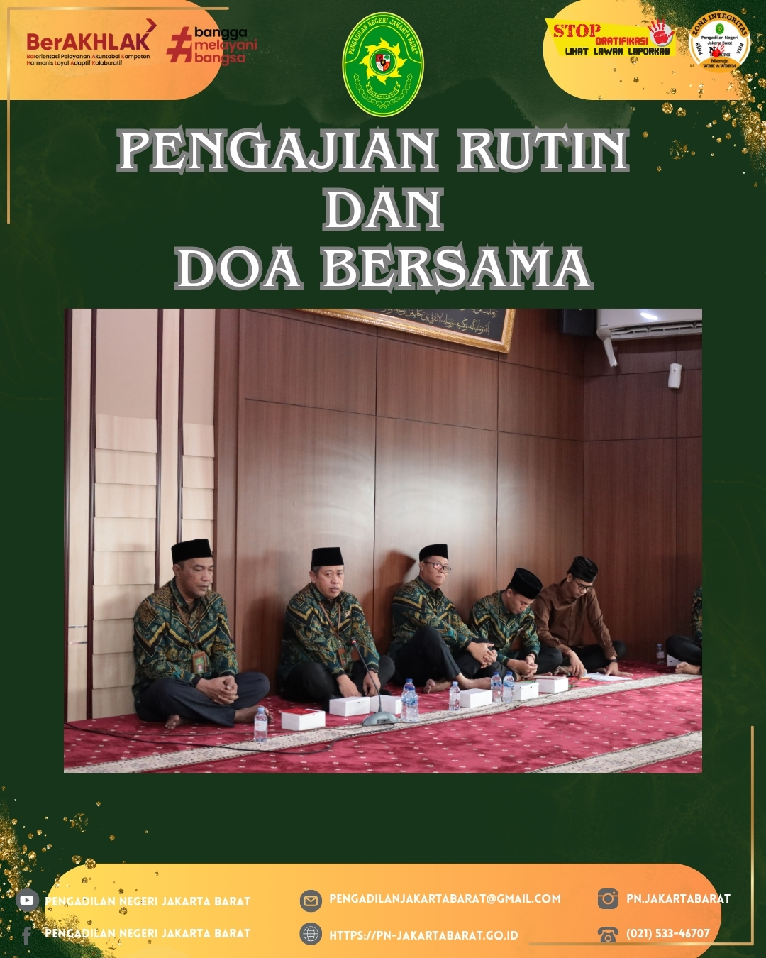 Bertempat di Masjid Ar Rahman Pengadilan Negeri Jakarta Barat, Telah dilaksanakan Pengajian Rutin Pembacaan Surat Yasin yang diiringi doa dan shalawat dengan tujuan semakin mendekatkan diri kepada Allah SWT.