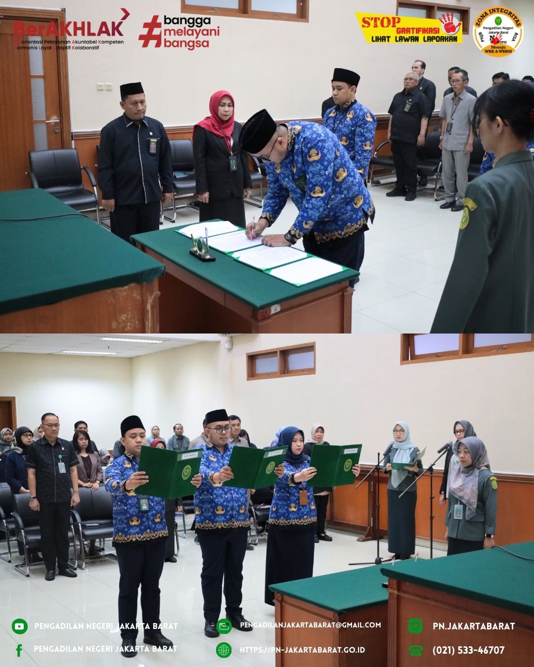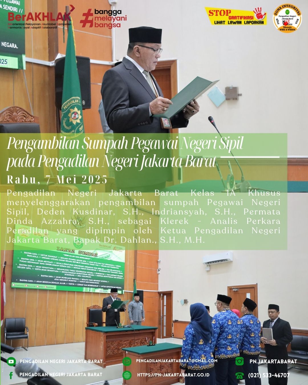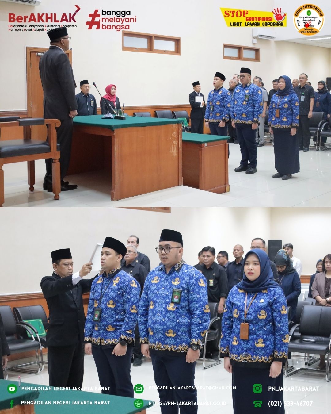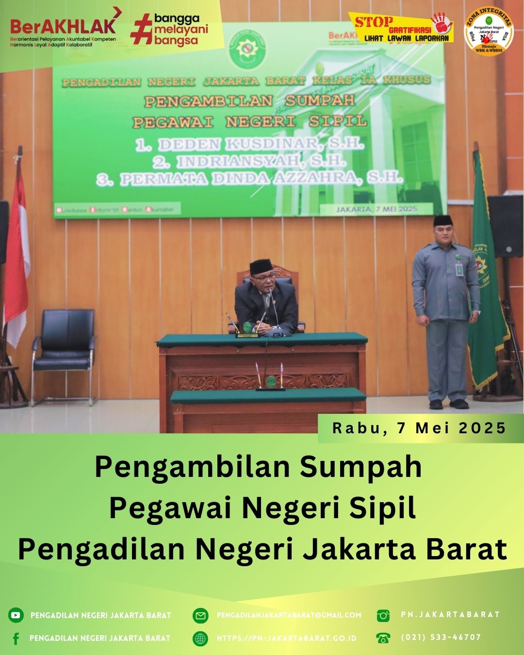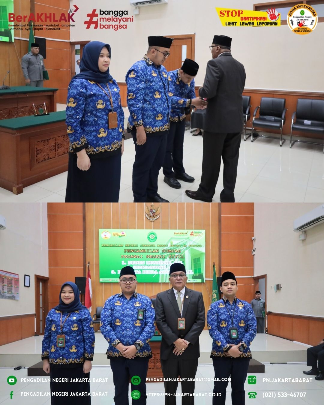 *PNJB, 7 Mei 2025* - Pengadilan Negeri Jakarta Barat Kelas 1A Khusus menyelenggarakan pengambilan sumpah Pegawai Negeri Sipil, Deden Kusdinar, S.H., Indriansyah, S.H., dan Permata Dinda Azzahra, S.H., sebagai Klerek - Analis Perkara Peradilan.