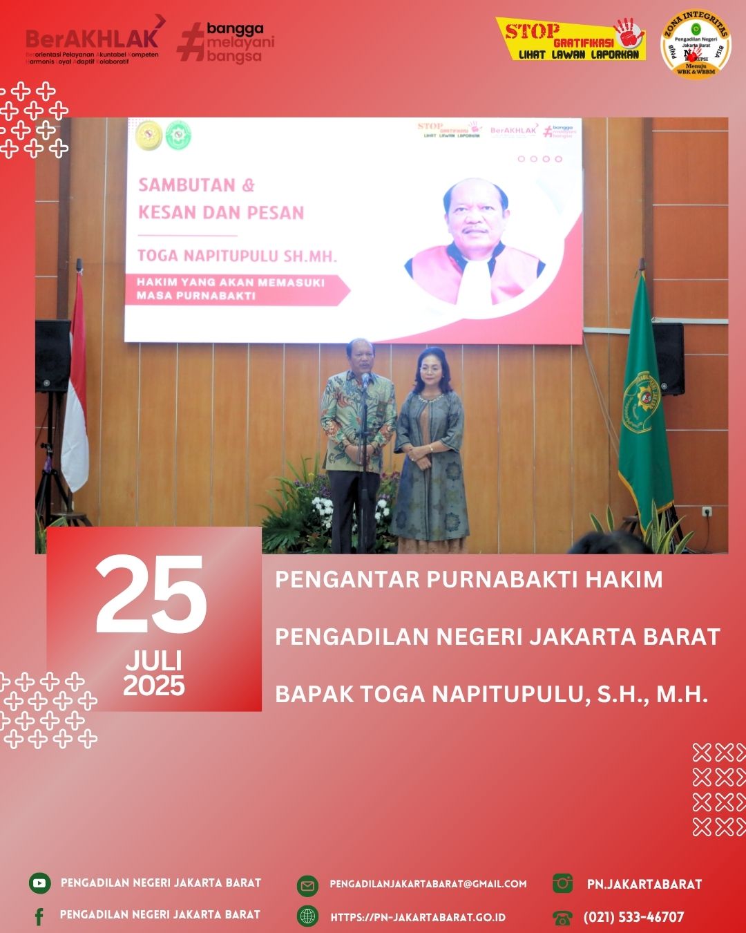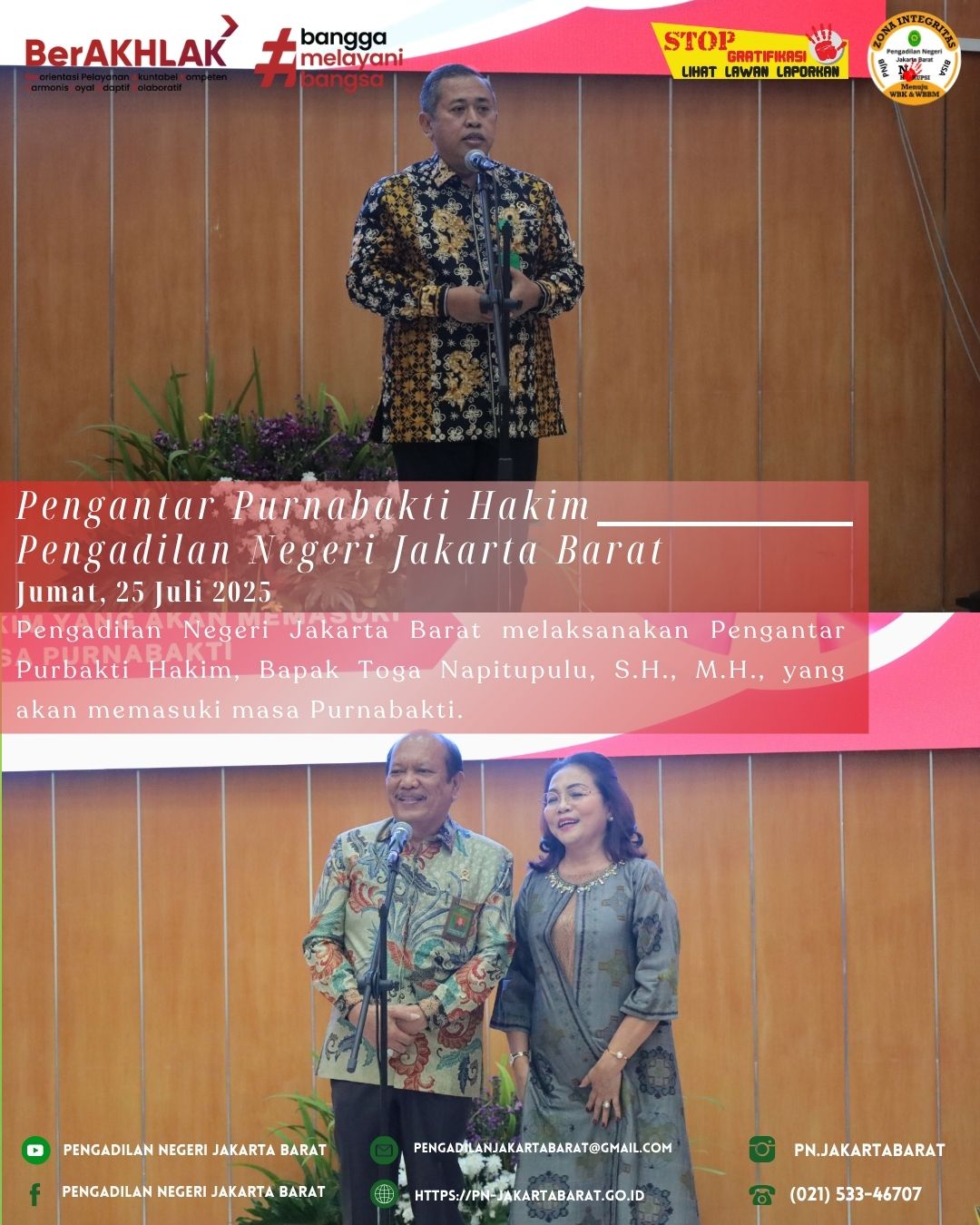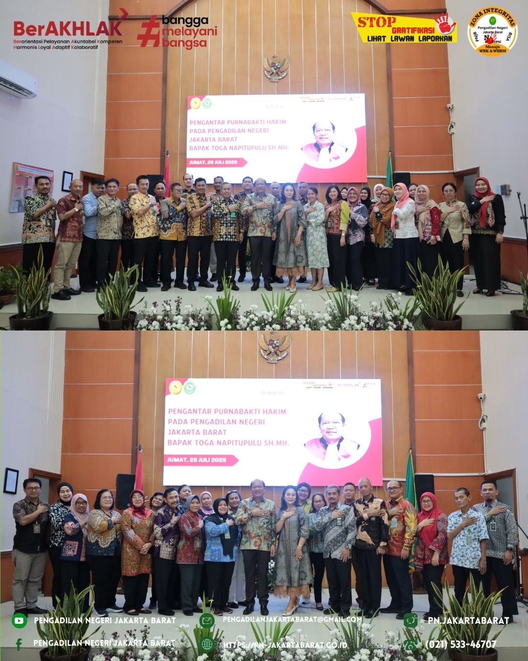 Pengadilan Negeri Jakarta Barat melaksanakan Pengantar Purbakti Hakim, Bapak Toga Napitupulu, S.H., M.H., yang akan memasuki masa Purnabakti.