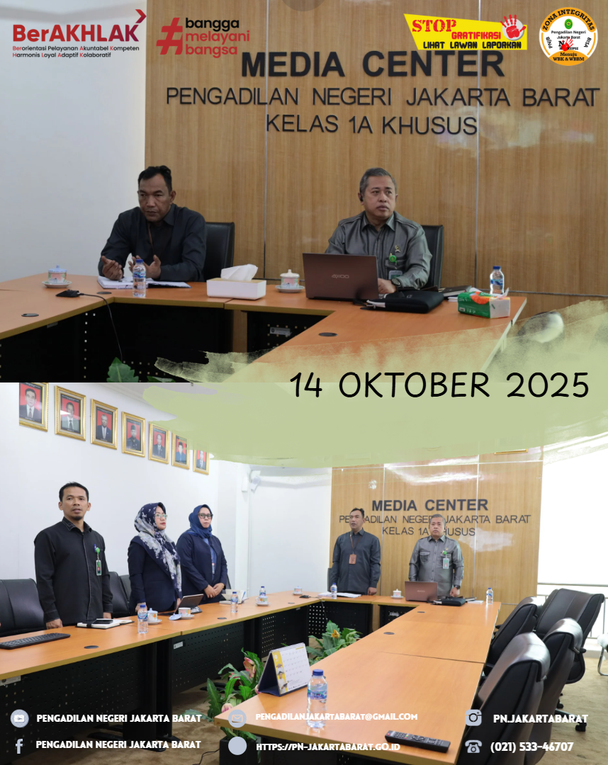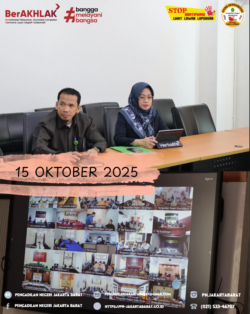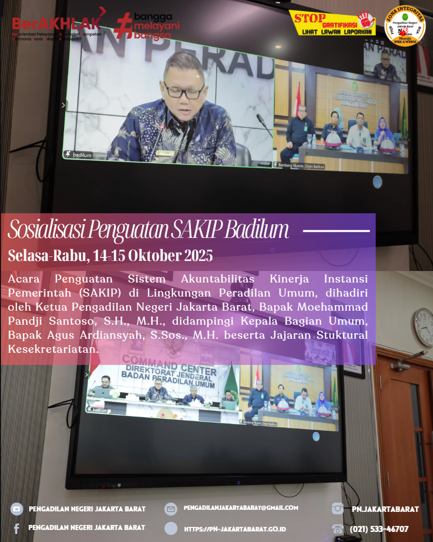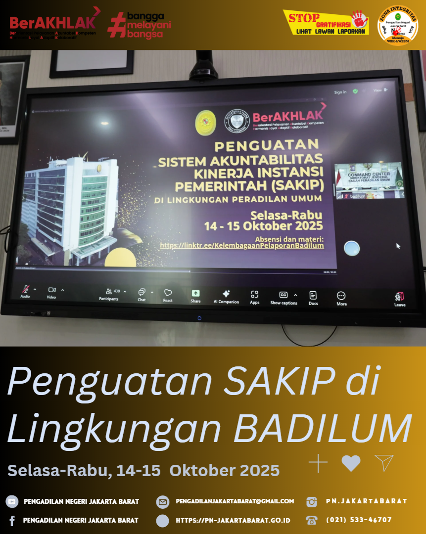 Selasa dan Rabu, 14-15 Oktober 2025, Pengadilan Negeri Jakarta Barat mengikuti acara Penguatan Sistem Akuntabilitas Kinerja Instansi Pemerintah (SAKIP) di pengadilan tinggi dan pengadilan negeri secara online yang diselenggarakan oleh Badan Peradilan Umum yang dihadiri oleh Ketua Pengadilan Negeri Jakarta Barat, Bapak Moehammad Pandji Santoso, S.H., M.H., didampingi Kepala Bagian Umum, Bapak Agus Ardiansyah, S.Sos., M.H. beserta Jajaran Stuktural Kesekretariatan.