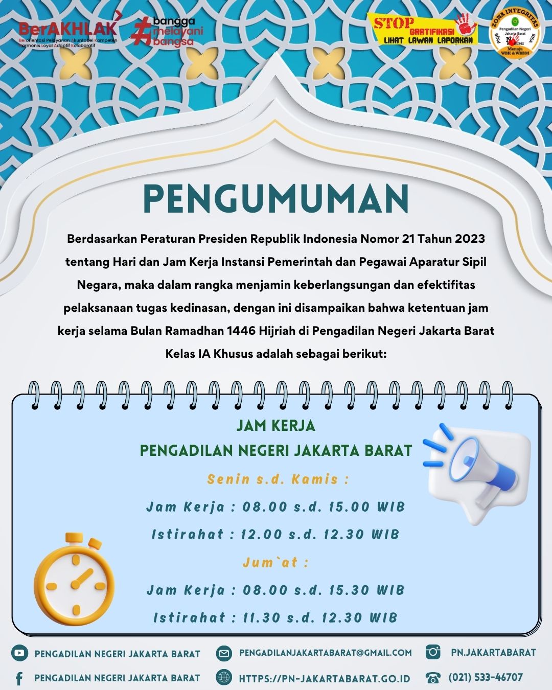 Berdasarkan Peraturan Presiden Republik Indonesia Nomor 21 Tahun 2023 tentang Hari dan Jam Kerja Instansi Pemerintah dan Pegawai Aparatur Sipil Negara, maka dalam rangka menjamin keberlangsungan dan efektifitas pelaksanaan tugas kedinasan, dengan ini disampaikan bahwa ketentuan jam kerja selama Bulan Ramadhan 1446 Hijriah di Pengadilan Negeri Jakarta Barat Kelas IA Khusus adalah sebagai berikut:
