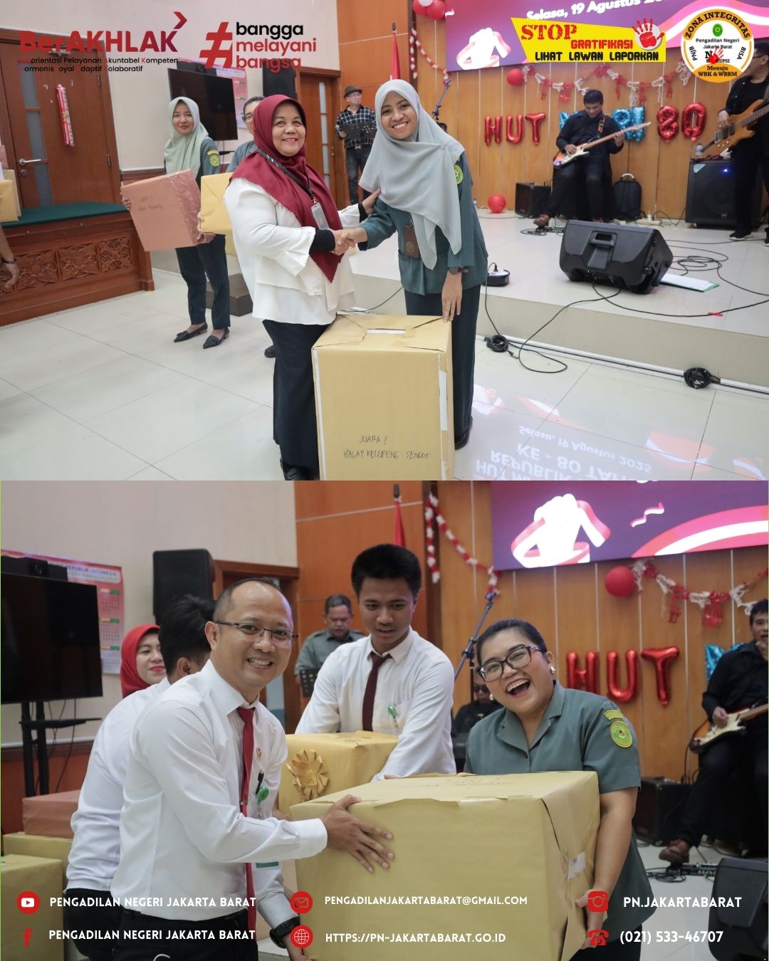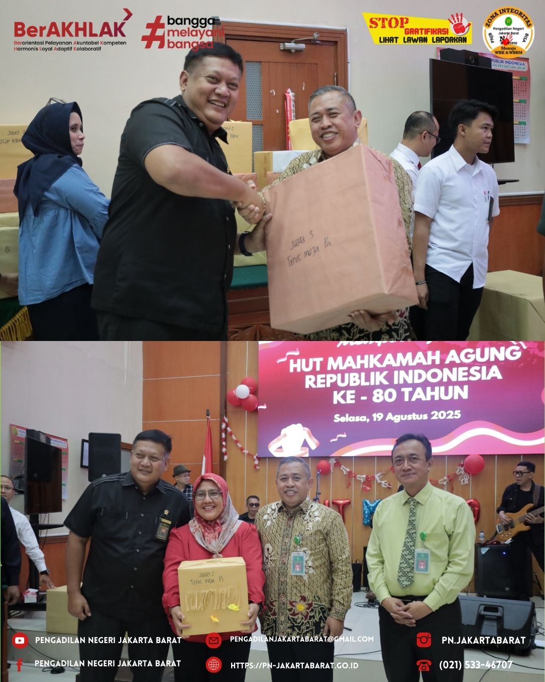 Pengadilan Negeri Jakarta Barat Kelas IA Khusus merayakan HUT RI ke - 80 dan HUT Mahkamah Agung RI ke- 80, dibuka dengan Sambutan dari Ketua Pengadilan Negeri Jakarta Barat, Bapak Moehammad Pandji Santoso, S.H., M.H., dan laporan dari Ketua Panitia Acara, Bapak Dedek Agus Kurniawan, S.H., M.H.