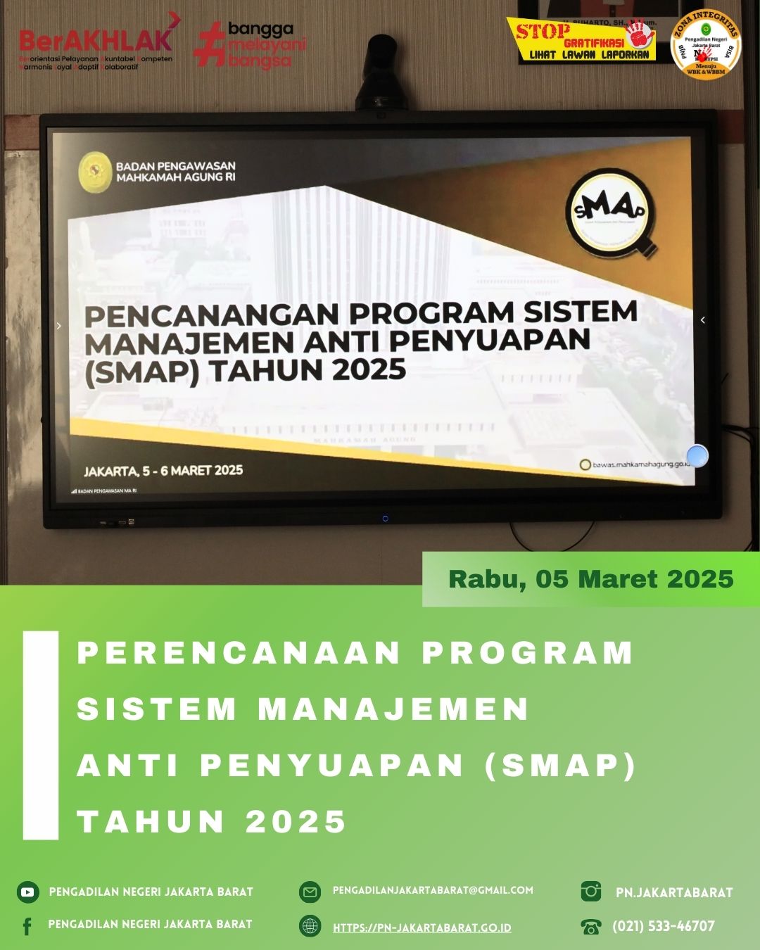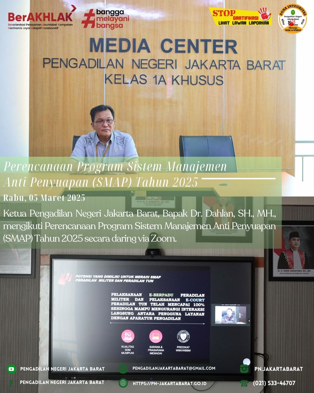 *PNJB, 05 Maret 2025* - Ketua Pengadilan Negeri Jakarta Barat, Bapak Dr. Dahlan, SH., MH., mengikuti Perencanaan Program Sistem Manajemen Anti Penyuapan (SMAP) Tahun 2025 secara daring via Zoom.