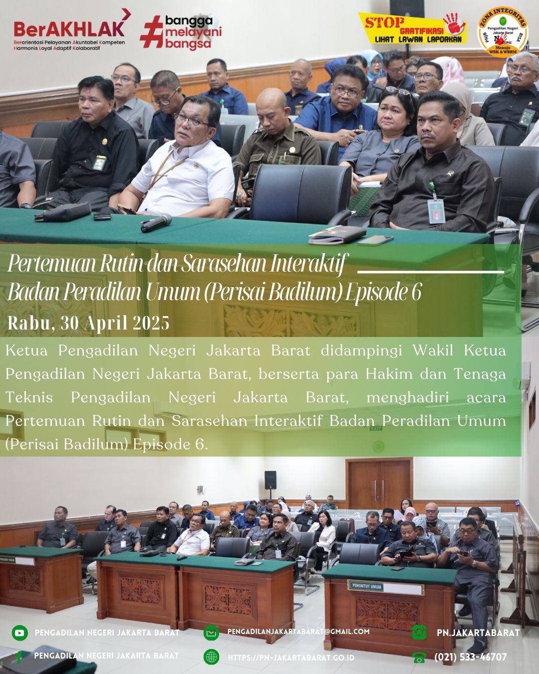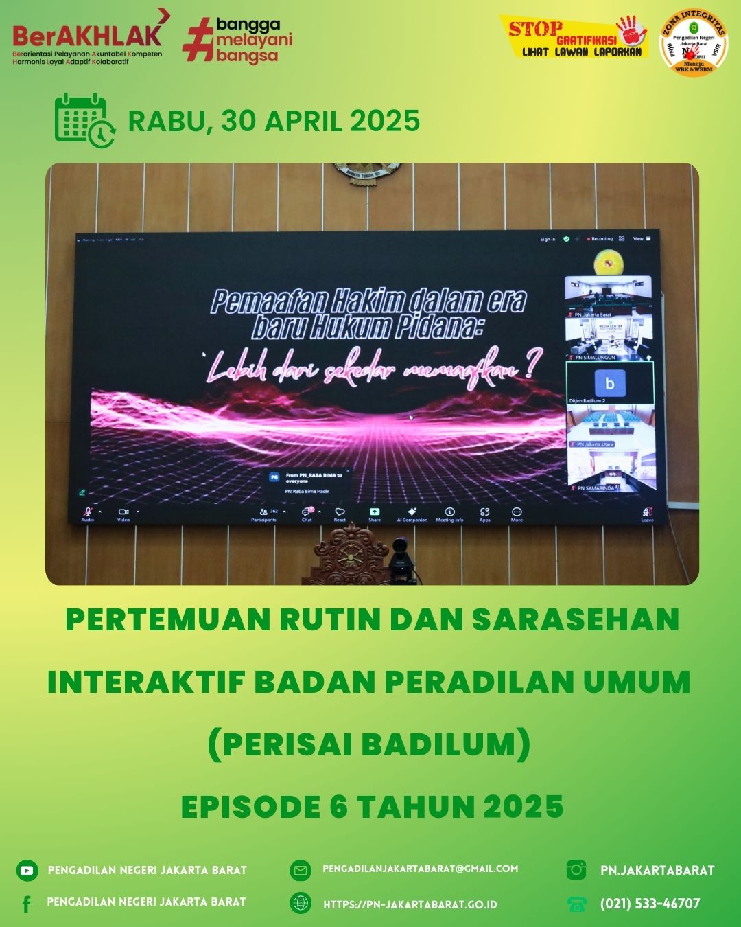 *PNJB, 30 April 2025* Ketua Pengadilan Negeri Jakarta Barat Kelas IA Khusus bersama para Hakim di Pengadilan Negeri Jakarta Barat Kelas IA Khusus, menghadiri acara Pertemuan Rutin dan Sarasehan Interaktif bersama Direktorat Jenderal Badan Peradilan Umum (Perisai Badilum) Episode 6 Tentang “Pemaafan Hakim Dalam Era Baru Hukum Pidana: Lebih Dari Sekedar Memaafkan?”