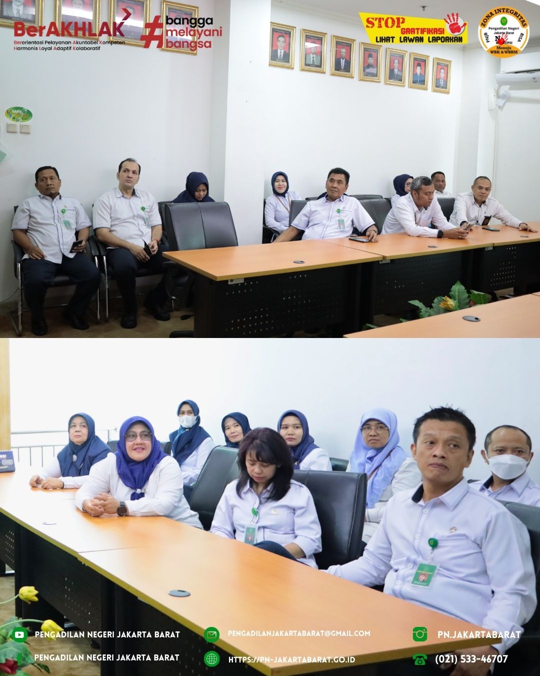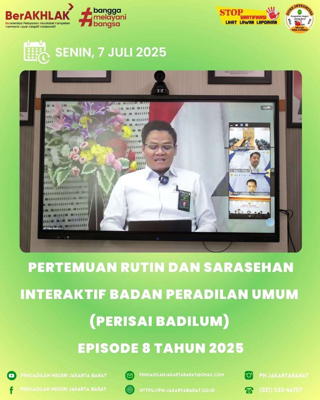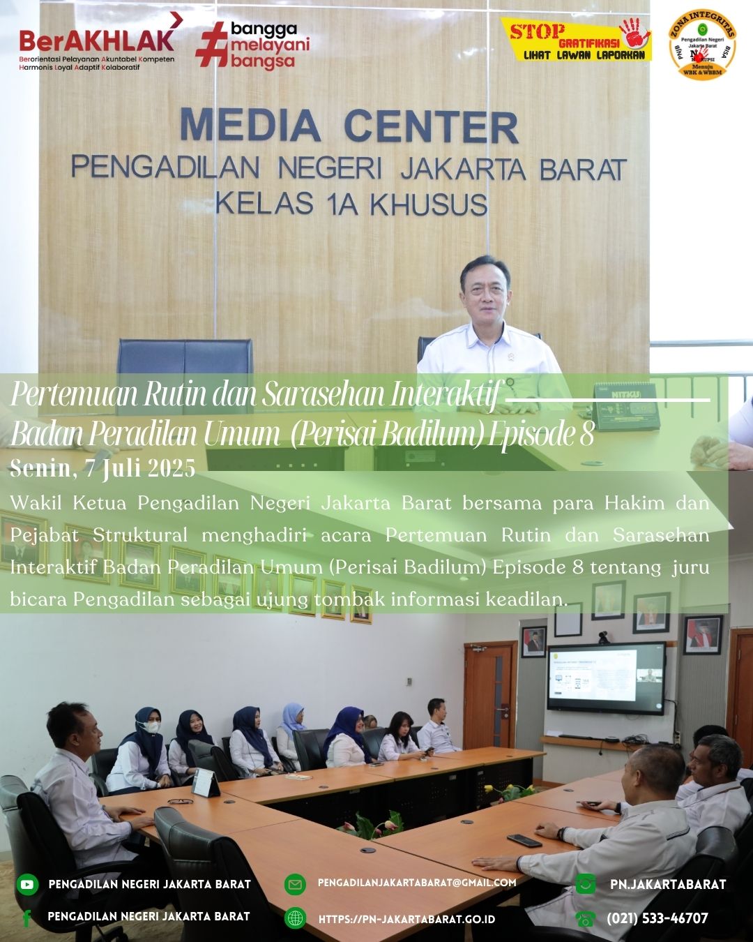 *PNJB, 7 Juli 2025* Ketua Pengadilan Negeri Jakarta Barat Kelas IA Khusus bersama para Hakim di Pengadilan Negeri Jakarta Barat Kelas IA Khusus, menghadiri acara Pertemuan Rutin dan Sarasehan Interaktif bersama Direktorat Jenderal Badan Peradilan Umum (Perisai Badilum) Episode 8 Tentang Juru Bicara Pengadilan sebagai ujung tombak informasi keadilan.