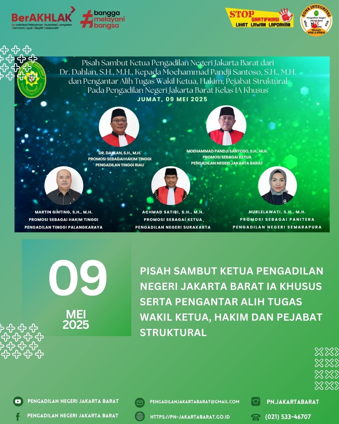 Bapak Dr. Dahlan, S.H., M.H., yang telah memimpin Pengadilan Negeri Jakarta Barat dengan dedikasi selama beberapa waktu, resmi melepas tanggung jawabnya kepada Ketua yang baru, Bapak Moehammad Pandji Santoso, S.H., M.H. Seremoni Pisah Sambut dihadiri oleh seluruh warga pengadilan, para Hakim, Pejabat Struktural, Pejabat Fungsional, serta para Pegawai Pengadilan, yang turut merayakan kepemimpinan yang telah berakhir.