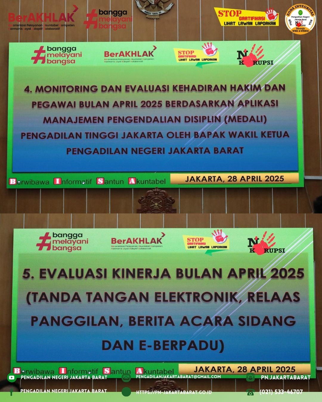 4. Monitoring dan Evaluasi kehadiran Hakim dan Pegawai bulan April 2025 berdasarkan Aplikasi Manajemen Pengendalian Disiplin (MEDALI) Pengadilan Tinggi Jakarta oleh Bapak Wakil Ketua Pengadilan Negeri Jakarta Barat Kelas IA Khusus;