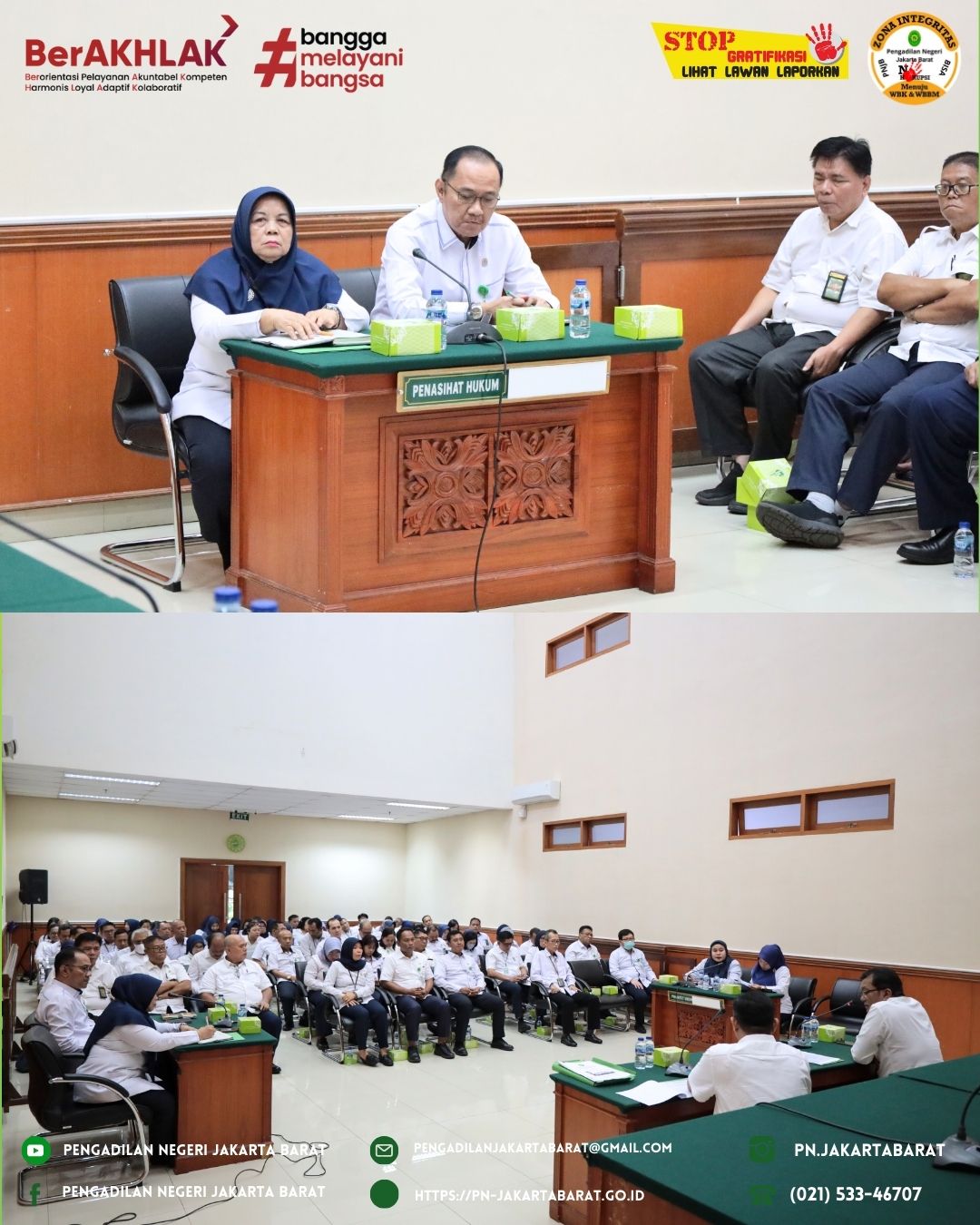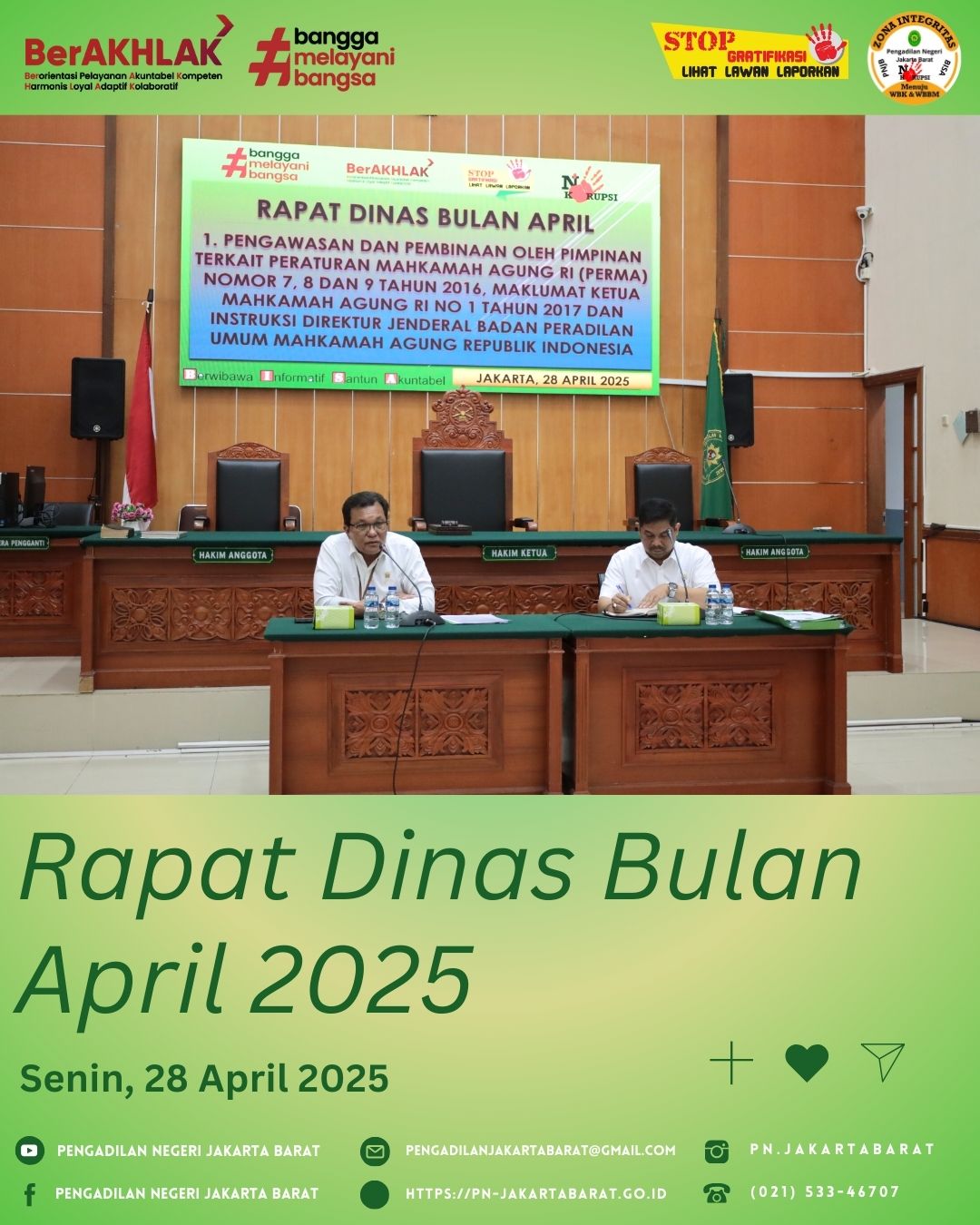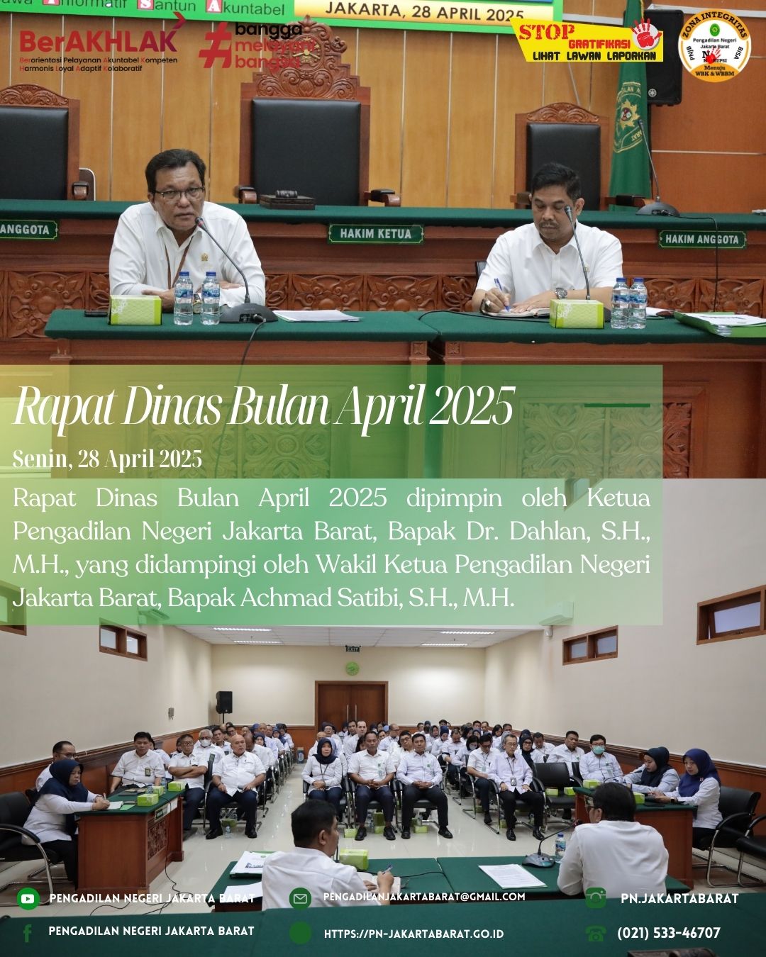 *PNJB, 28 April 2025* - Rapat Dinas Bulan April 2025 dipimpin oleh Ketua Pengadilan Negeri Jakarta Barat Kelas IA Khusus, Bapak Dr. Dahlan, S.H., M.H., didampingi oleh Wakil Ketua Pengadilan Negeri Jakarta Barat Kelas IA Khusus, Bapak Achmad Satibi, S.H., M.H. yang dihadiri oleh para Hakim, para Pejabat Struktural dan Fungsional, para Panitera Pengganti, para Jurusita, para Jurusita Pengganti, Pelaksana dan juga Honorer pada Pengadilan Negeri Jakarta Barat Kelas IA Khusus.