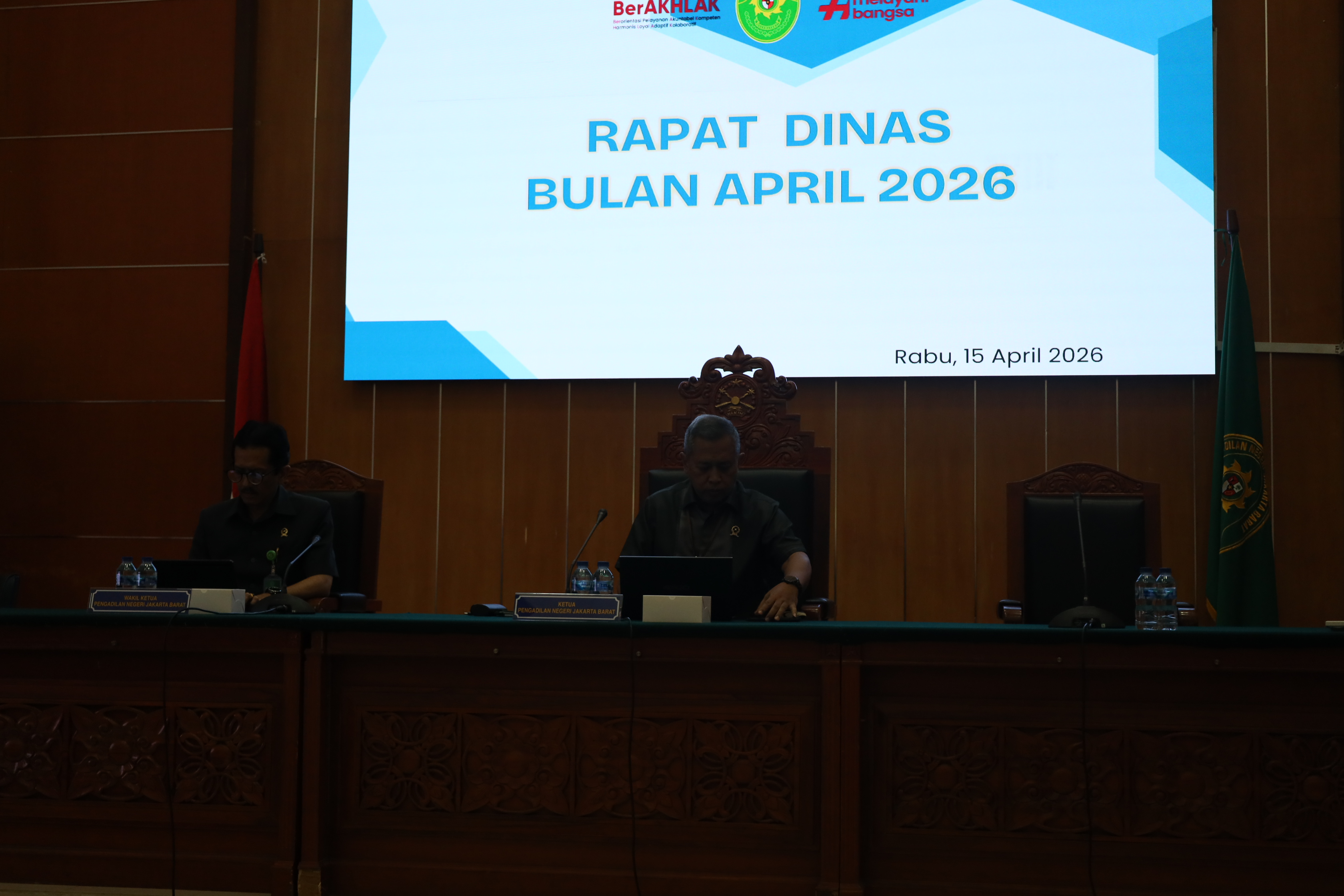 Jakarta - 15 April 2026, Bertempat di Ruang Sidang Utama Kusumah Atmadja Pengadilan Negeri Jakarta Barat Kelas IA Khusus dilaksanakan Rapat Dinas Bulan April Tahun 2026. Rapat ini dipimpin langsung oleh Ketua Pengadilan Negeri Jakarta Barat Kelas IA Khusus Bpk. Moehammad Pandji Santoso S.H, M.H. dan Wakil Ketua Bpk. Mateus Sukusno Aji, S.H., M.Hum serta dihadiri oleh Seluruh Hakim, Pejabat Sturktural, Pejabat Fungsional, Aparatur Sipil Negera, PPNPN dan Outsourcing Pada Pengadilan Negeri Jakarta Barat Kelas IA Khusus.
