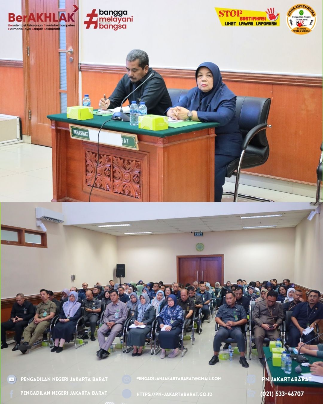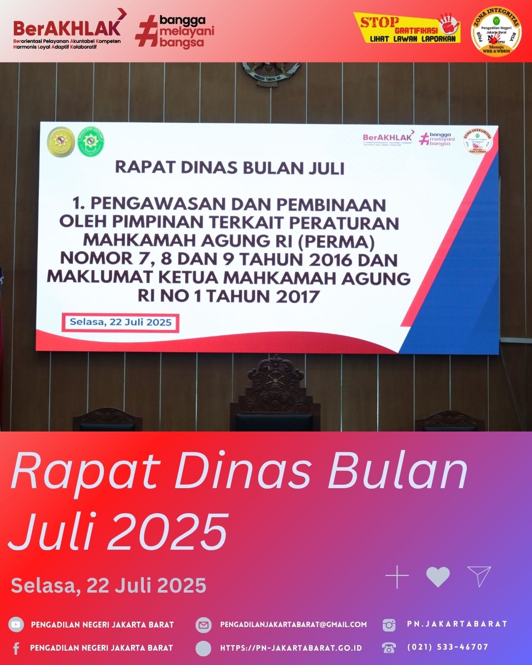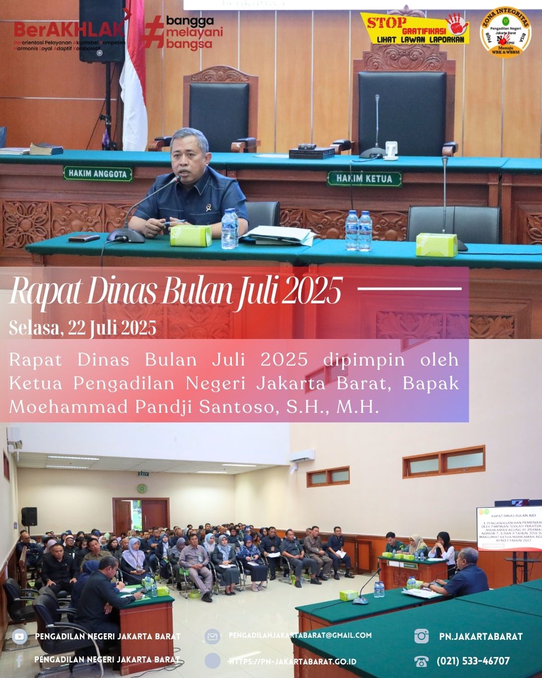 Rapat Dinas Bulan Juli 2025 dipimpin oleh Ketua Pengadilan Negeri Jakarta Barat Kelas IA Khusus, Bapak Moehammad Pandji Santoso, S.H., M.H., yang dihadiri oleh para Hakim, para Pejabat Struktural, para Pejabat Fungsional, para Panitera Pengganti, para Jurusita, para Jurusita Pengganti, Pelaksana dan juga Honorer pada Pengadilan Negeri Jakarta Barat Kelas IA Khusus.