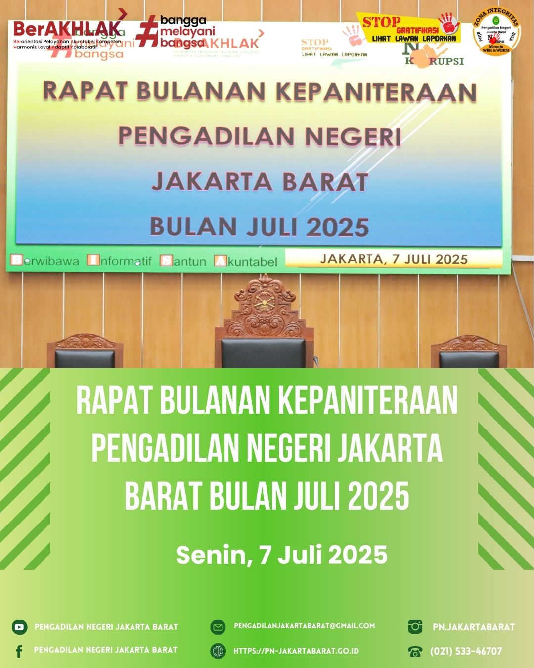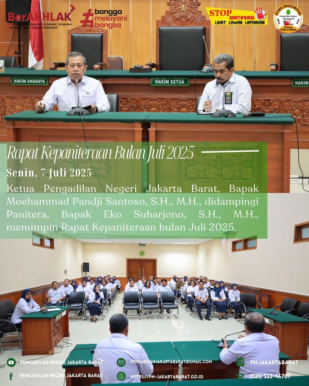 *PNJB,7 Juli 2025* Hari ini telah berlangsung Rapat Kepaniteraan bulan Juli 2025 yang dipimpin oleh Ketua Pengadilan Negeri Jakarta Barat, Bapak Moehammad Pandji Santoso, S.H., M.H., didampingi Panitera, Bapak Eko Suharjono, S.H., M.H.