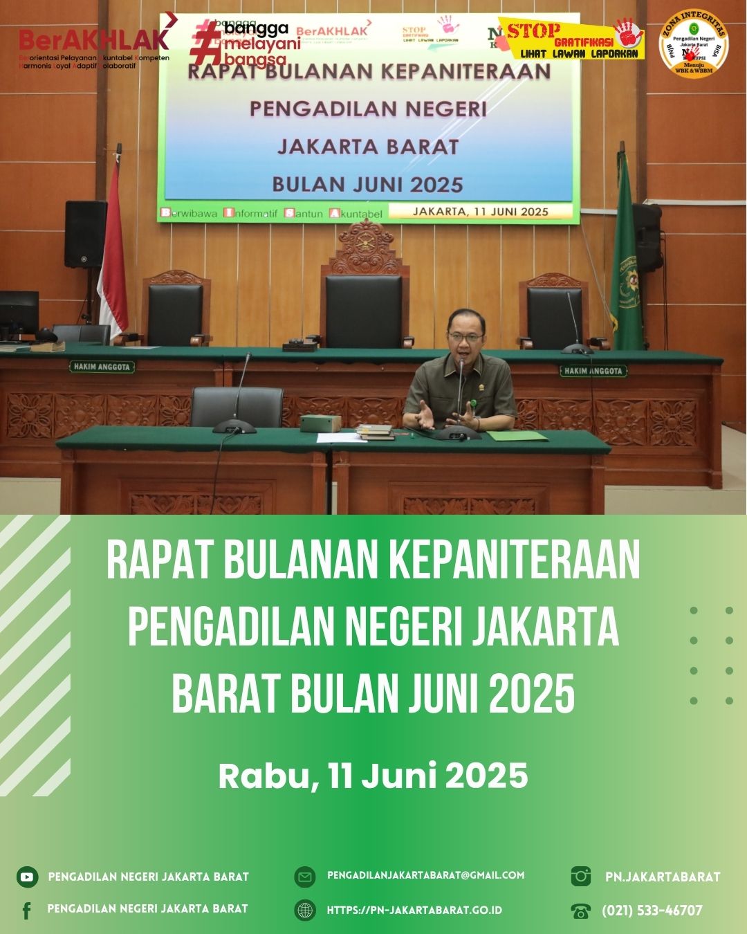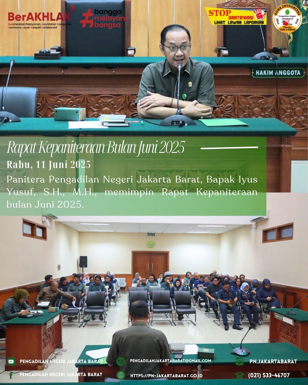 *PNJB,11 Juni 2025* Hari ini telah berlangsung Rapat Kepaniteraan bulan Juni 2025 yang dipimpin oleh Panitera Pengadilan Negeri Jakarta Barat, Bapak Iyus Yusuf, S.H., M.H.