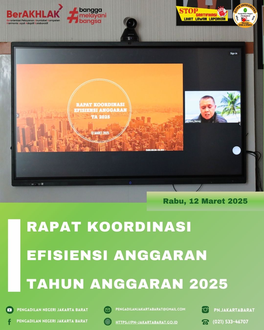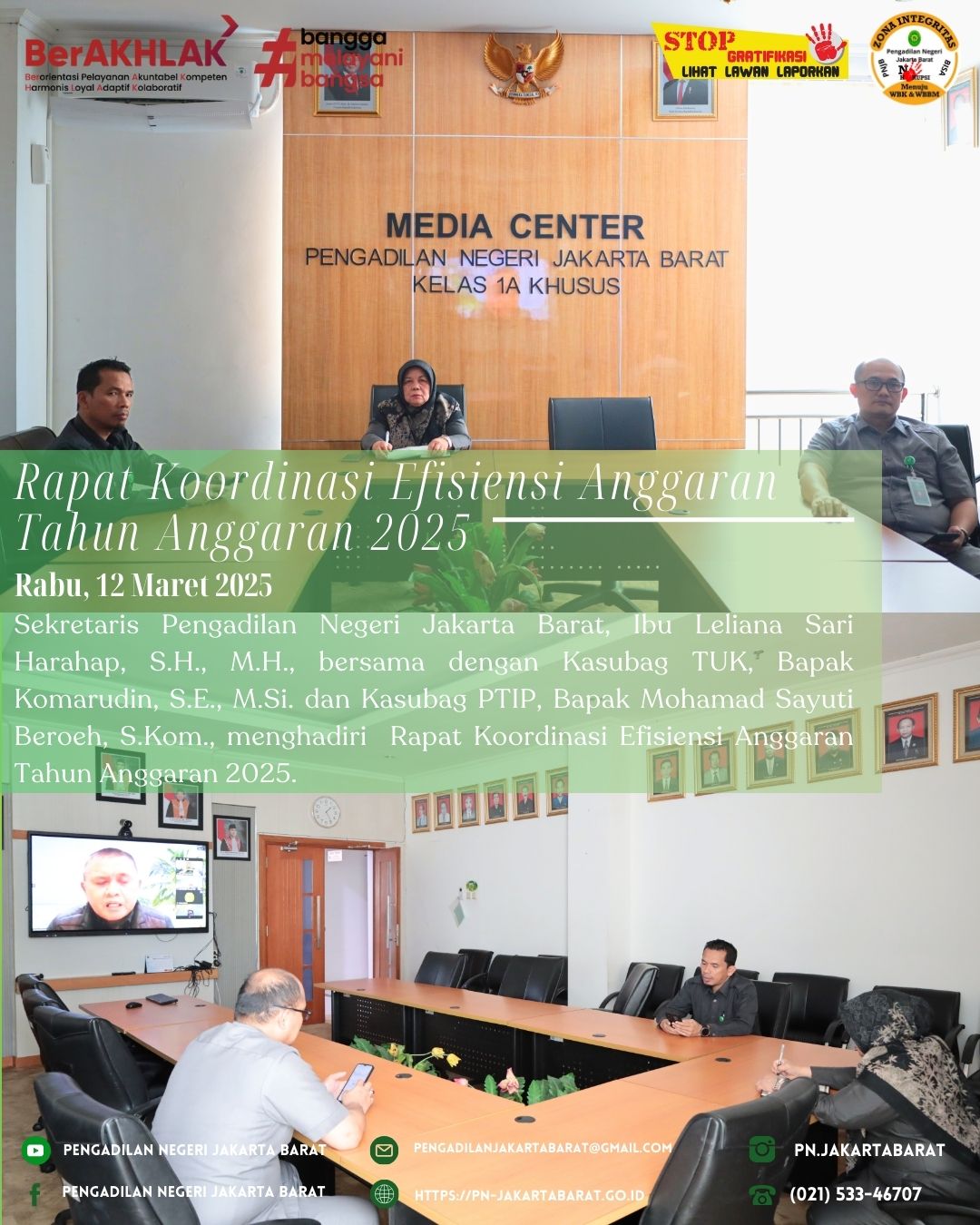 *PNJB, 12 Maret 2025* - Sekretaris Pengadilan Negeri Jakarta Barat, Ibu Leliana Sari Harahap, S.H., M.H., bersama dengan Kasubag TUK, Bapak Komarudin, S.E., M.Si. dan Kasubag PTIP, Bapak Mohamad Sayuti Beroeh, S.Kom., menghadiri Rapat Koordinasi Efisiensi Anggaran Tahun Anggaran 2025, yang diselenggarakan Biro Perencanaan dan Organisasi Mahkamah Agung secara daring via Zoom.