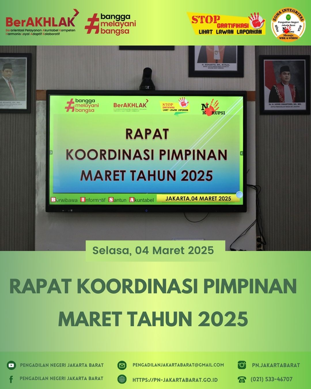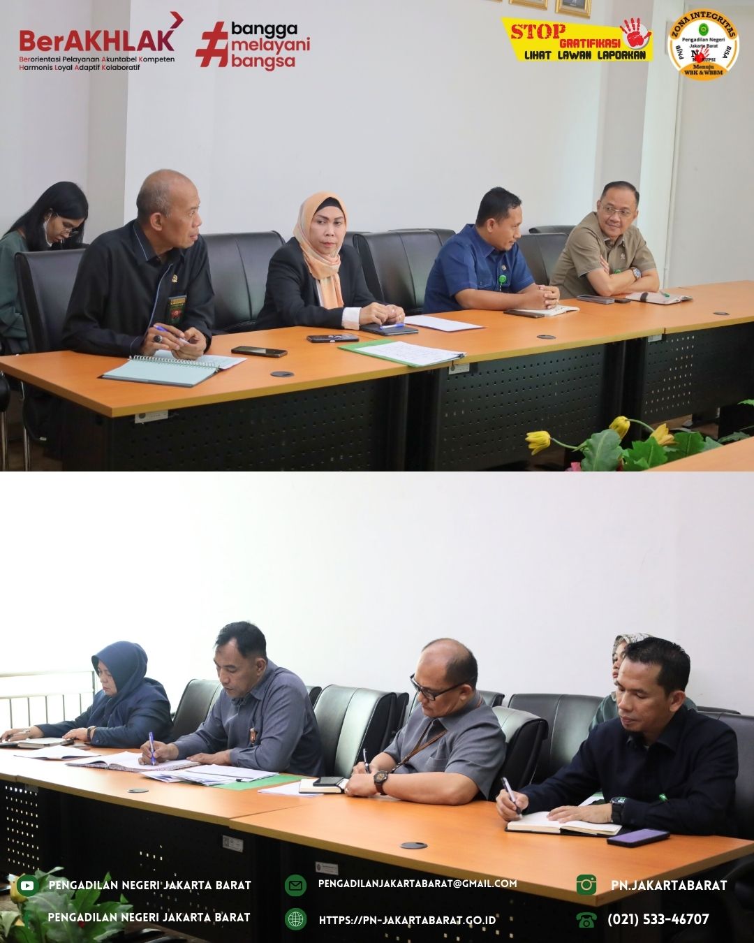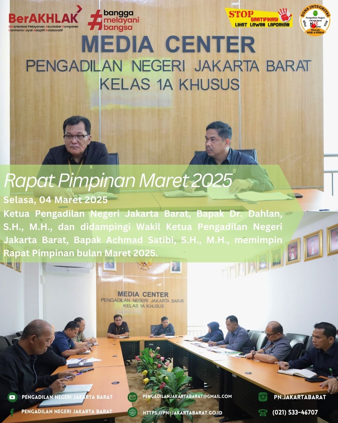 *PNJB, 04 Maret 2025* - Rapat pimpinan dibuka oleh Ketua Pengadilan Negeri Jakarta Barat, Bapak Dr. Dahlan, S.H., M.H., bersama Wakil Ketua Pengadilan Negeri Jakarta Barat, Bapak Achmad Satibi, S.H.,M.H. beserta Panitera, Sekretaris, Kepala Bagian Umum, para Panitera Muda, dan para Kepala Sub Bagian, untuk membahas tentang evaluasi kinerja masing-masing bidang.