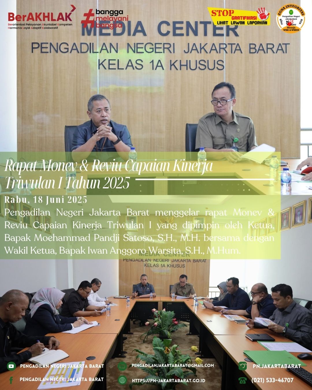 *PNJB, 18 Juni 2025* - Pengadilan Negeri Jakarta Barat menggelar rapat Monev & Reviu Capaian Kinerja Triwulan I yang dipimpin oleh Ketua, Bapak Moehammad Pandji Santoso, S.H., M.H. bersama dengan Wakil Ketua, Bapak Iwan Anggoro Warsita, S.H., M.Hum., yang dihadiri oleh Tim Reviu SAKIP.