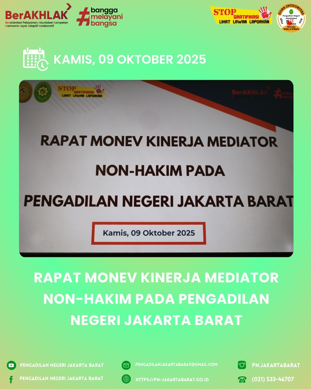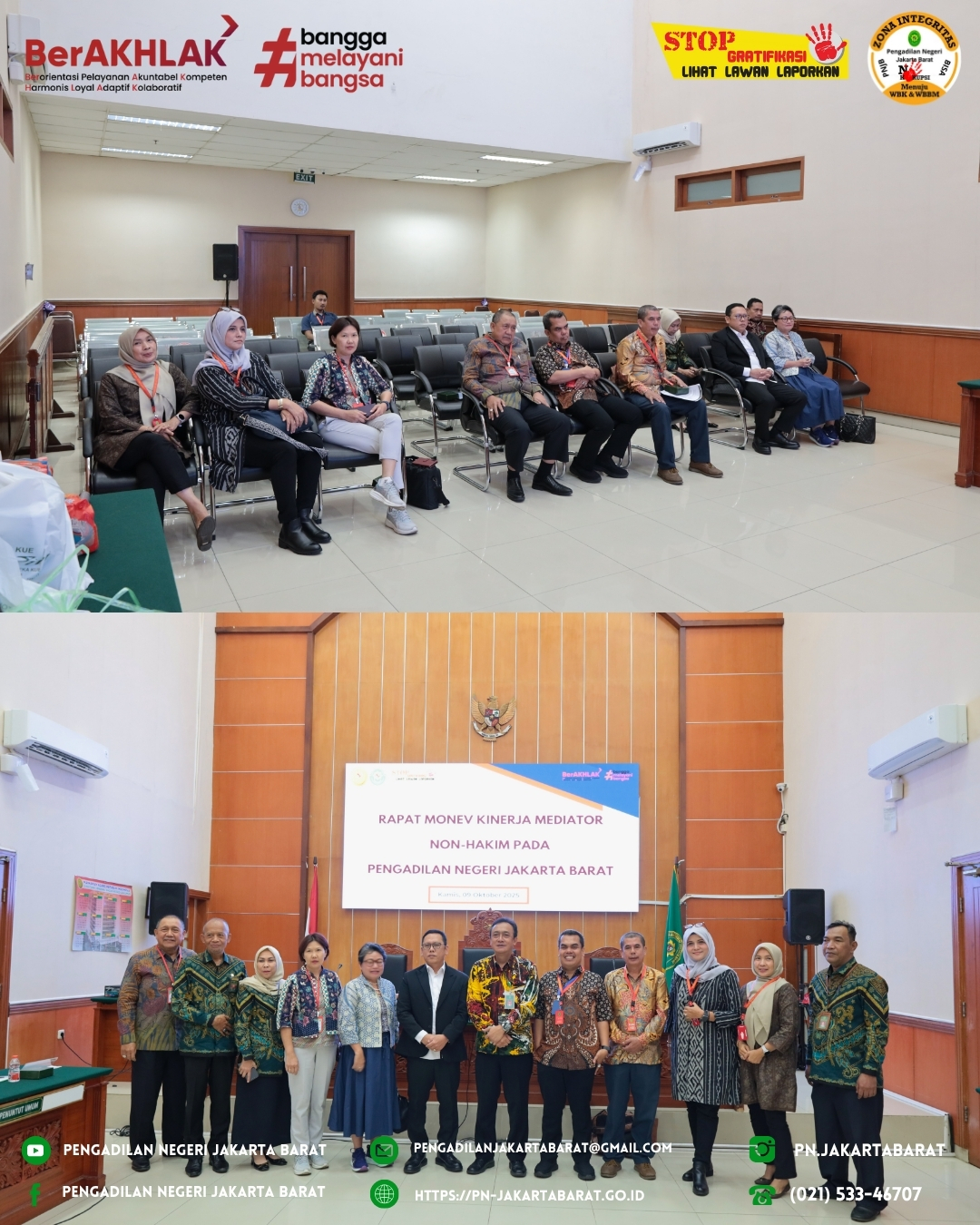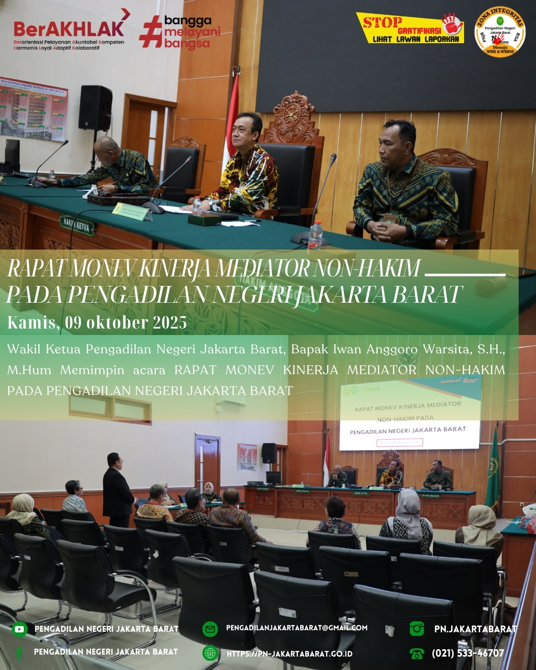 Wakil Ketua Pengadilan Negeri Jakarta Barat, Bapak Iwan Anggoro Warsita, S.H., M.Hum., memimpin RAPAT MONEV KINERJA MEDIATOR NON-HAKIM PADA PENGADILAN NEGERI JAKARTA BARAT yang didampingi oleh Panitera Muda Hukum, Bapak Wasino, S.H., M.H dan Kepala Bagian Umum Pengadilan Negeri Jakarta Barat, Bapak Agus Ardiansyah, S.Sos., M.H., serta Koordinator Mediator Non Hakim dan Para Mediator Non Hakim pada Pengadilan Negeri Jakarta Barat turut hadir dalam pertemuan rapat ini.