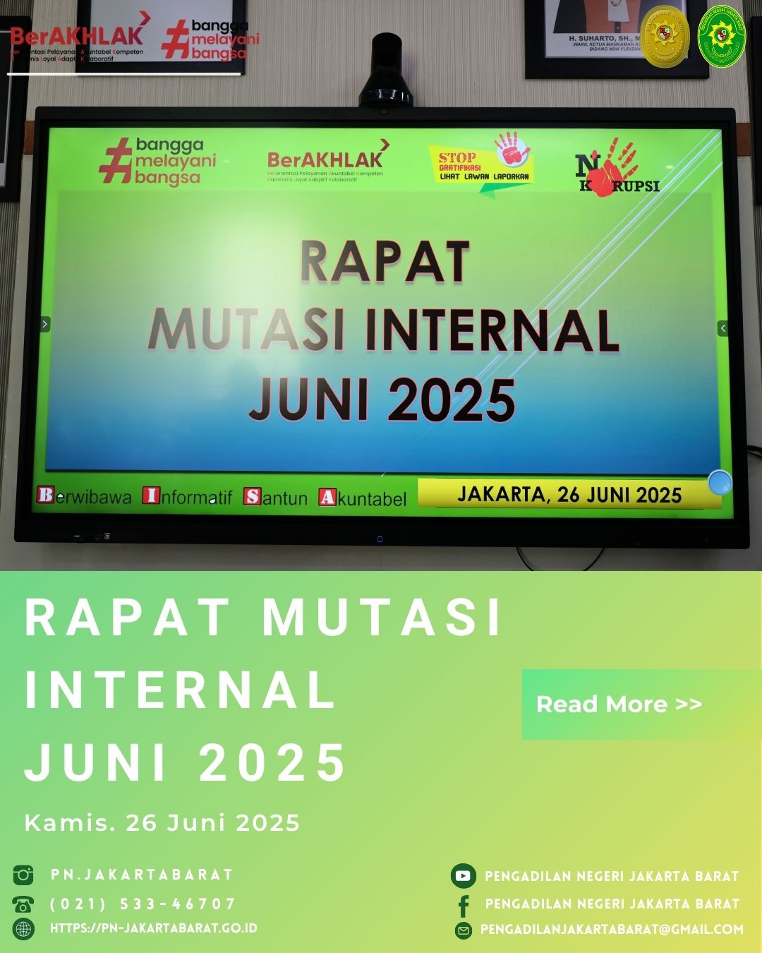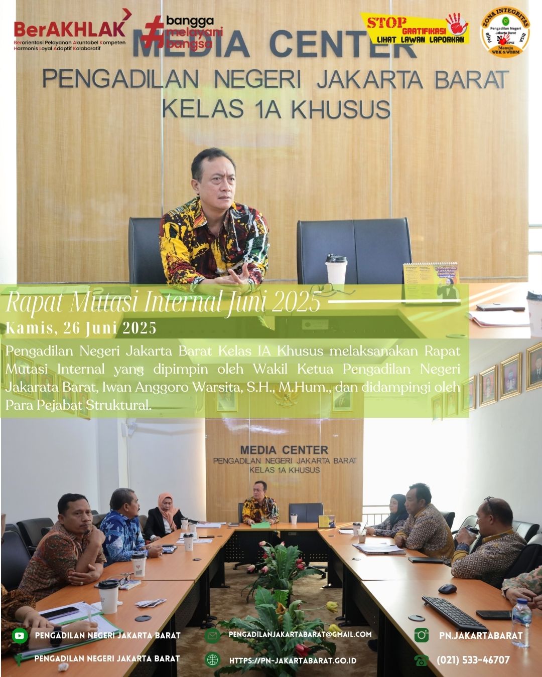*PNJB, 26 Juni 2025* - Pengadilan Negeri Jakarta Barat Kelas IA Khusus melaksanakan Rapat Mutasi Internal yang dipimpin oleh Wakil Ketua Pengadilan Negeri Jakarata Barat, Iwan Anggoro Warsita, S.H., M.Hum., dan didampingi oleh Para Pejabat Struktural.