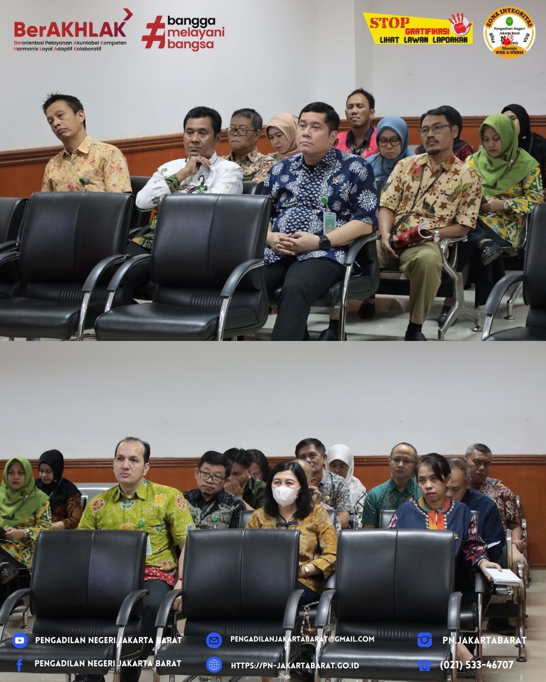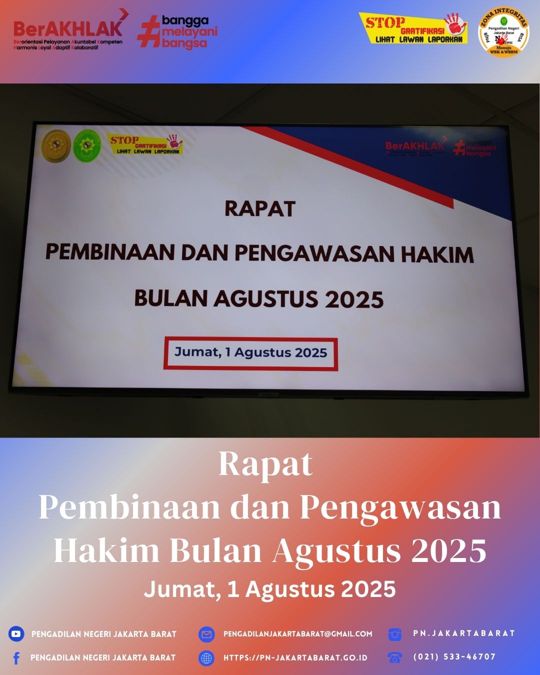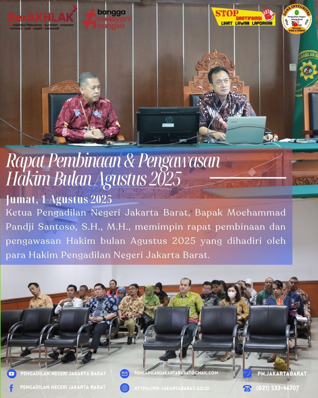 Bertempat di Ruang Sidang Sarwata, Ketua Pengadilan Negeri Jakarta Barat Kelas IA Khusus, Bapak Moehammad Pandji Santoso, S.H., M.H., bersama Wakil Ketua Pengadilan Negeri Jakarta Barat Kelas IA Khusus, Bapak Iwan Anggoro Warsita, S.H., M. Hum., memimpin rapat pembinaan dan pengawasan Hakim bulan Agustus 2025 yang dihadiri oleh para Hakim Pengadilan Negeri Jakarta Barat Kelas IA Khusus.
