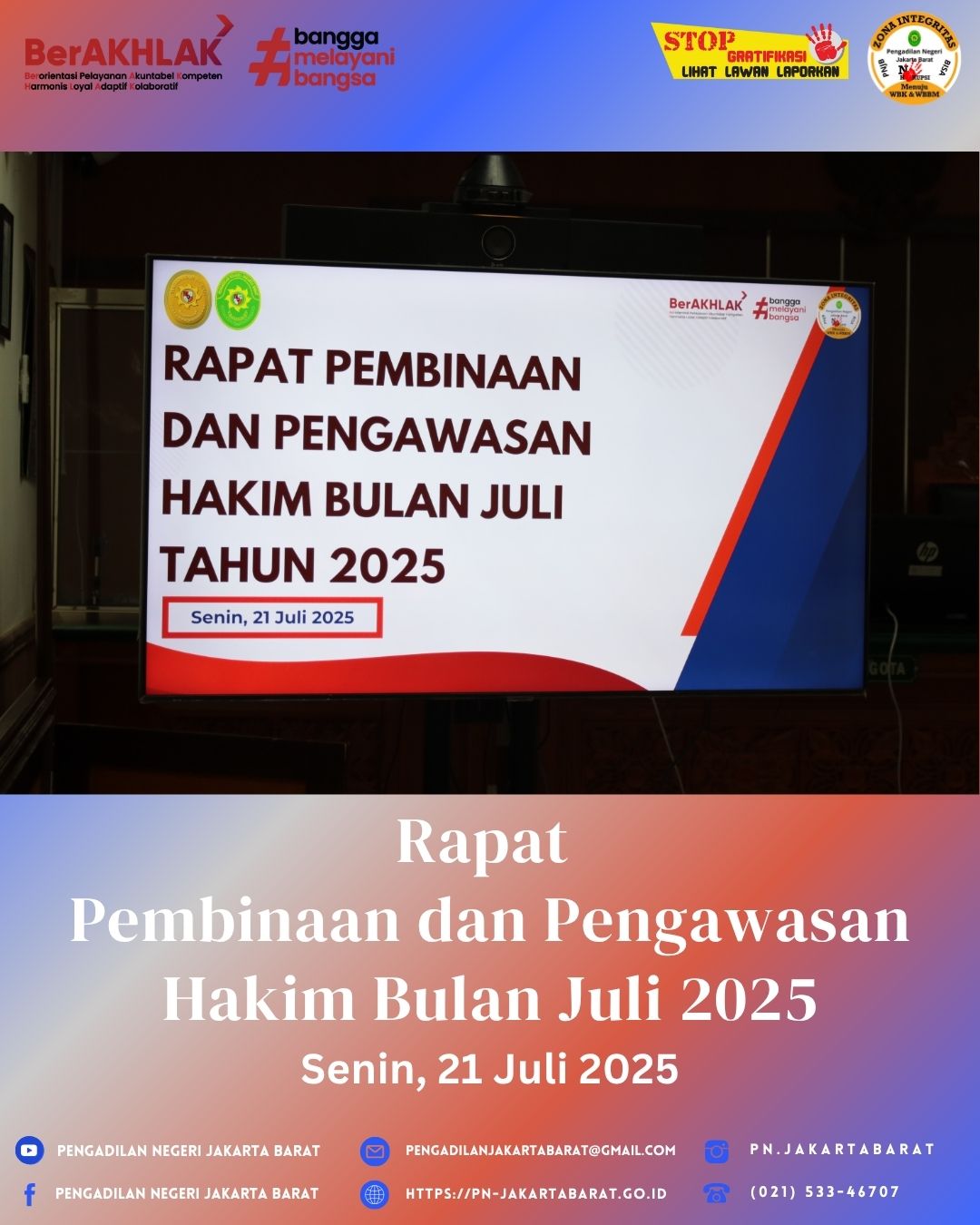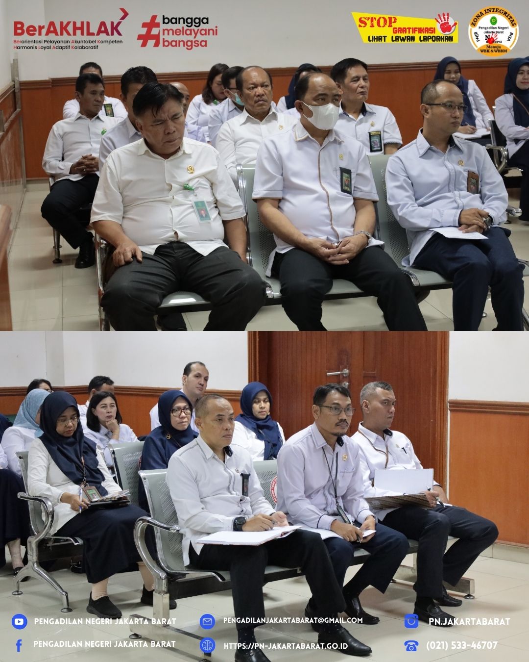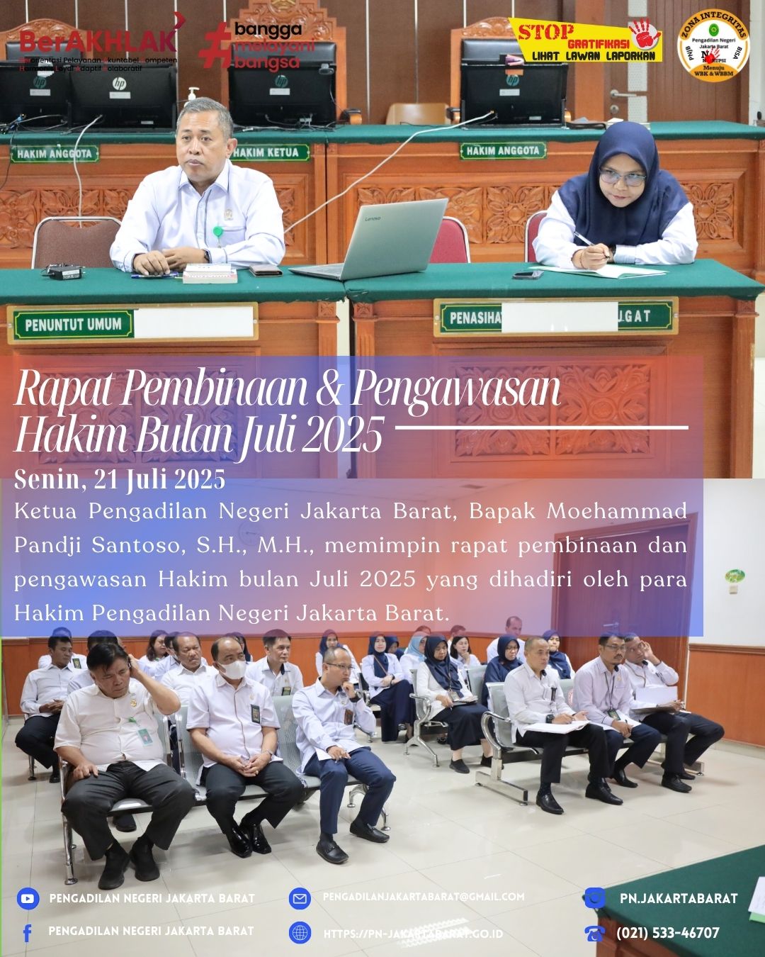 Bertempat di Ruang Sidang Sarwata Lantai 2, Ketua Pengadilan Negeri Jakarta Barat Kelas IA Khusus, Bapak Moehammad Pandji Santoso, S.H., M.H., memimpin rapat pembinaan dan pengawasan Hakim bulan Juli 2025 yang dihadiri oleh para Hakim Pengadilan Negeri Jakarta Barat Kelas IA Khusus.