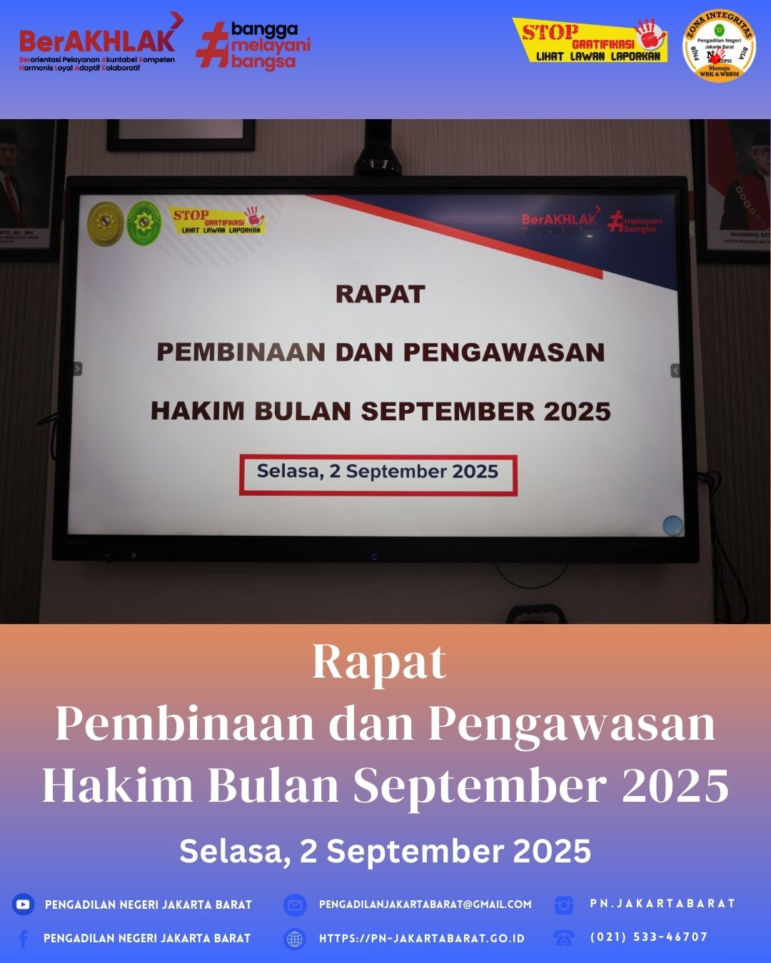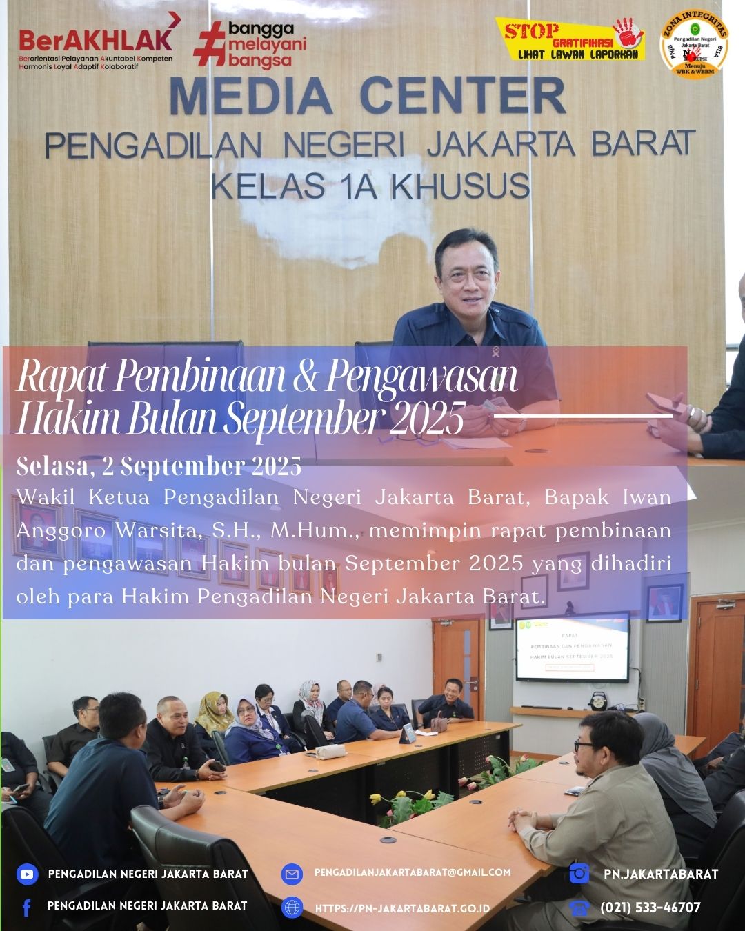 Bertempat di Ruang Media Center, Wakil Ketua Pengadilan Negeri Jakarta Barat Kelas IA Khusus, Bapak Iwan Anggoro Warsita, S.H., M. Hum., memimpin Rapat Pembinaan dan Pengawasan Hakim bulan September 2025 yang dihadiri oleh para Hakim Pengadilan Negeri Jakarta Barat Kelas IA Khusus.