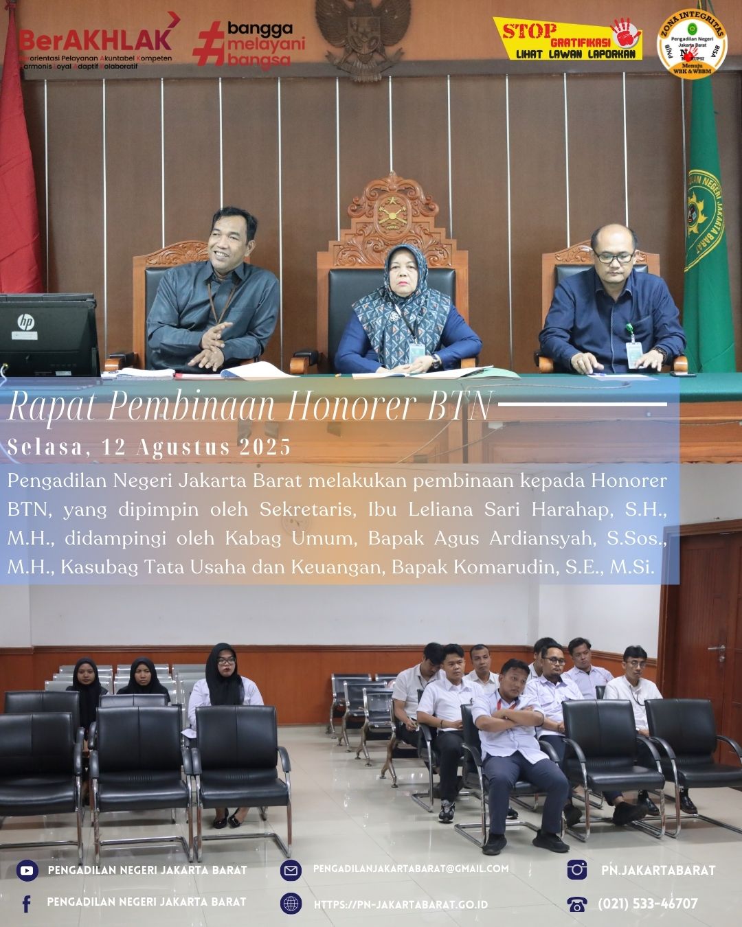 Hari ini telah berlangsung Rapat Pembinaan Honorer BTN Bulan Agustus 2025 yang dipimpin oleh Sekretaris, Ibu Leliana Sari Harahap, S.H., M.H., didampingi oleh Kabag Umum, Bapak Agus Ardiansyah, S.Sos., M.H., Kasubag Tata Usaha dan Keuangan, Bapak Komarudin, S.E., M.Si.