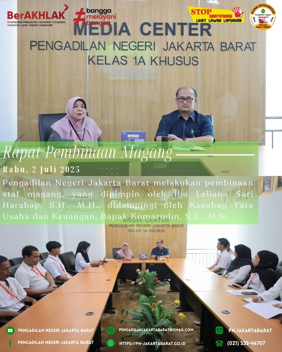 *PNJB, 2 Juli 2025* - Pengadilan Negeri Jakarta Barat melakukan pembinaan staf magang, yang dipimpin oleh Ibu Leliana Sari Harahap, S.H., M.H., didampingi oleh Kasubag Tata Usaha dan Keuangan, Bapak Komarudin, S.E., M.Si.