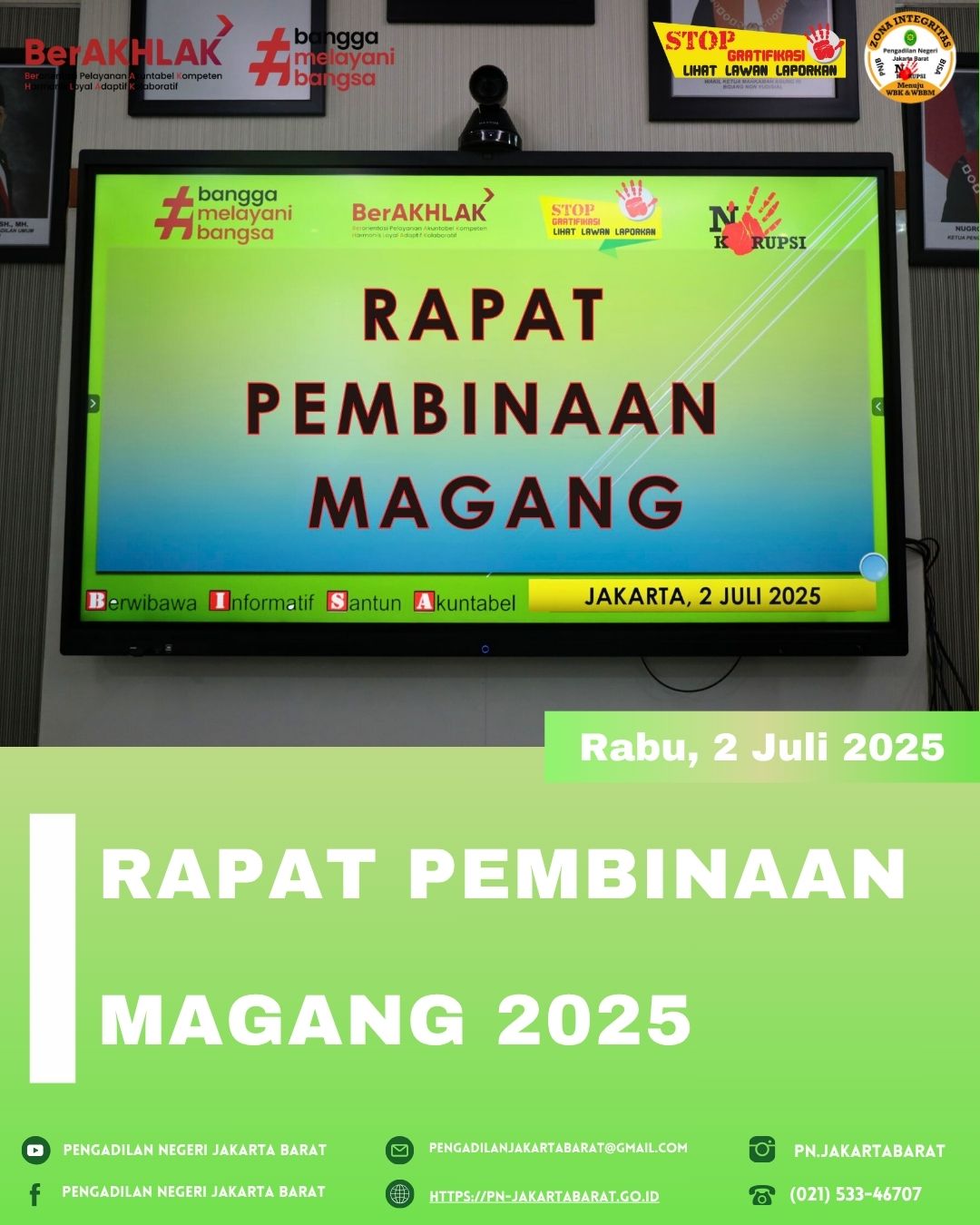 Pengadilan Negeri Jakarta Barat berharap dengan adanya Rapat Pembinaan Magang 2025 ini, dapat menciptakan keteraturan dan memberikan pengalaman kerja yang bermanfaat untuk meningkatkan kemampuan mereka dalam bekerja.