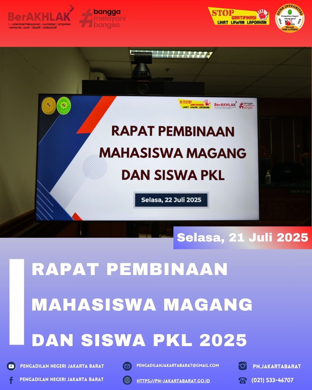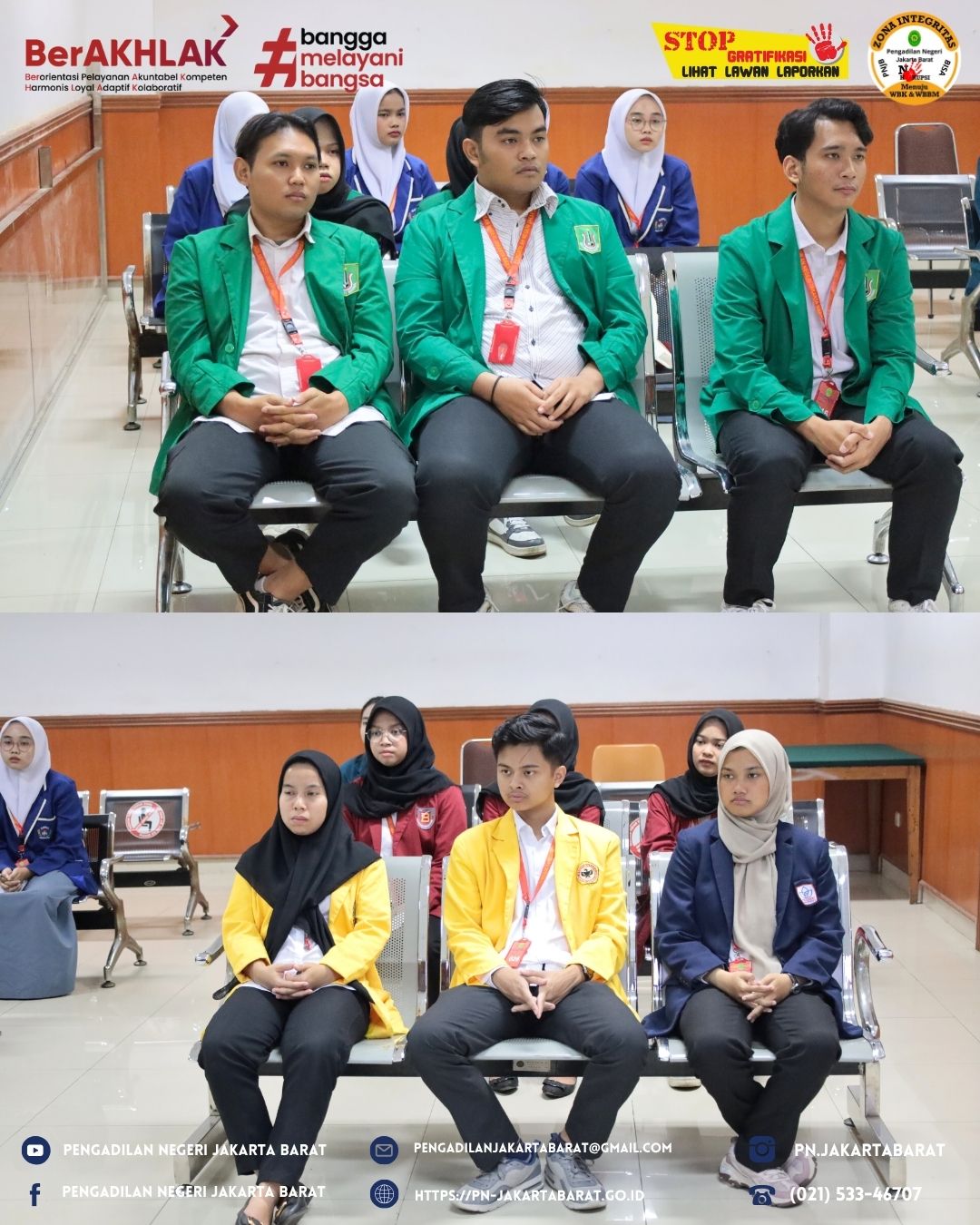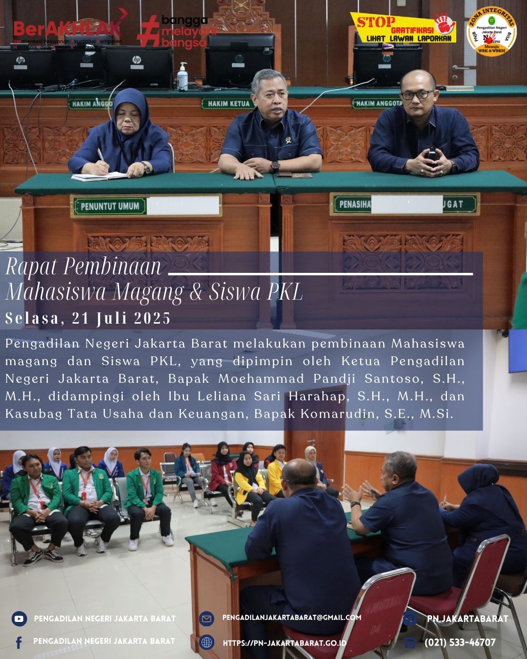 Pengadilan Negeri Jakarta Barat Kelas IA Khusus melakukan pembinaan Mahasiswa magang dan Siswa PKL, yang dipimpin oleh Ketua Pengadilan Negeri Jakarta Barat Kelas IA Khusus, Bapak Moehammad Pandji Santoso, S.H., M.H., Sekretaris, Ibu Leliana Sari Harahap, S.H., M.H., didampingi oleh Kasubag Tata Usaha dan Keuangan, Bapak Komarudin, S.E., M.Si.