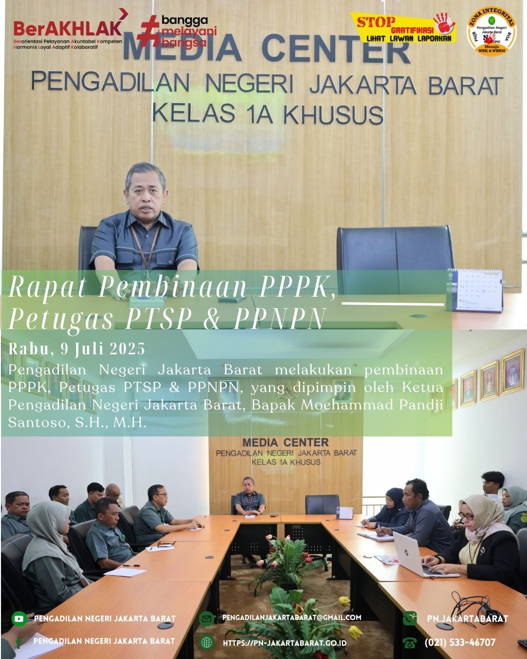 *PNJB, 9 Juli 2025* - Pengadilan Negeri Jakarta Barat melakukan pembinaan PPPK, Petugas PTSP dan PPNPN, yang dipimpin oleh Ketua Pengadilan Negeri Jakarta Barat, Bapak Moehammad Pandji Santoso, S.H., M.H.