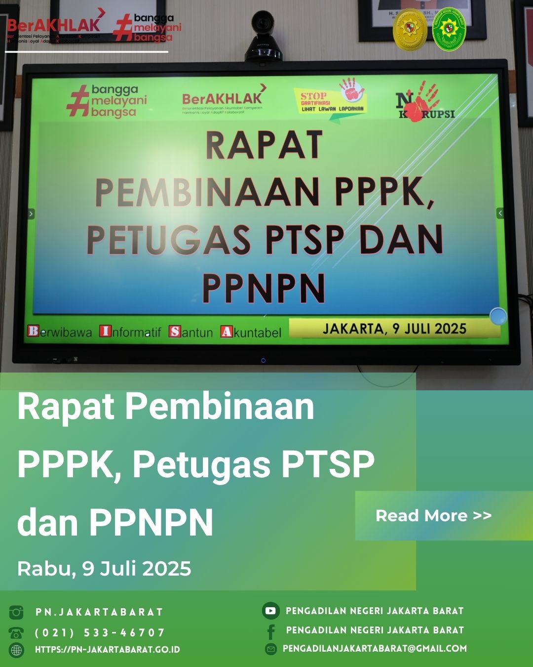 Pengadilan Negeri Jakarta Barat berharap dengan adanya Rapat Pembinaan PPPK, Petugas PTSP dan PPNPN, dapat menciptakan keteraturan dan meningkatkan kinerja PPPK, Petugas PTSP dan PPNPN supaya proses pelayanan baik secara teknis dan administrasi dapat berjalan dengan lancar dan efisien.