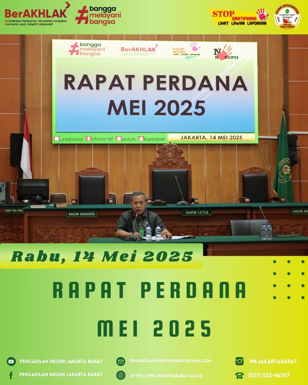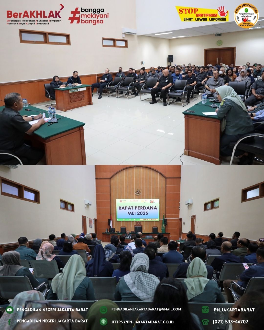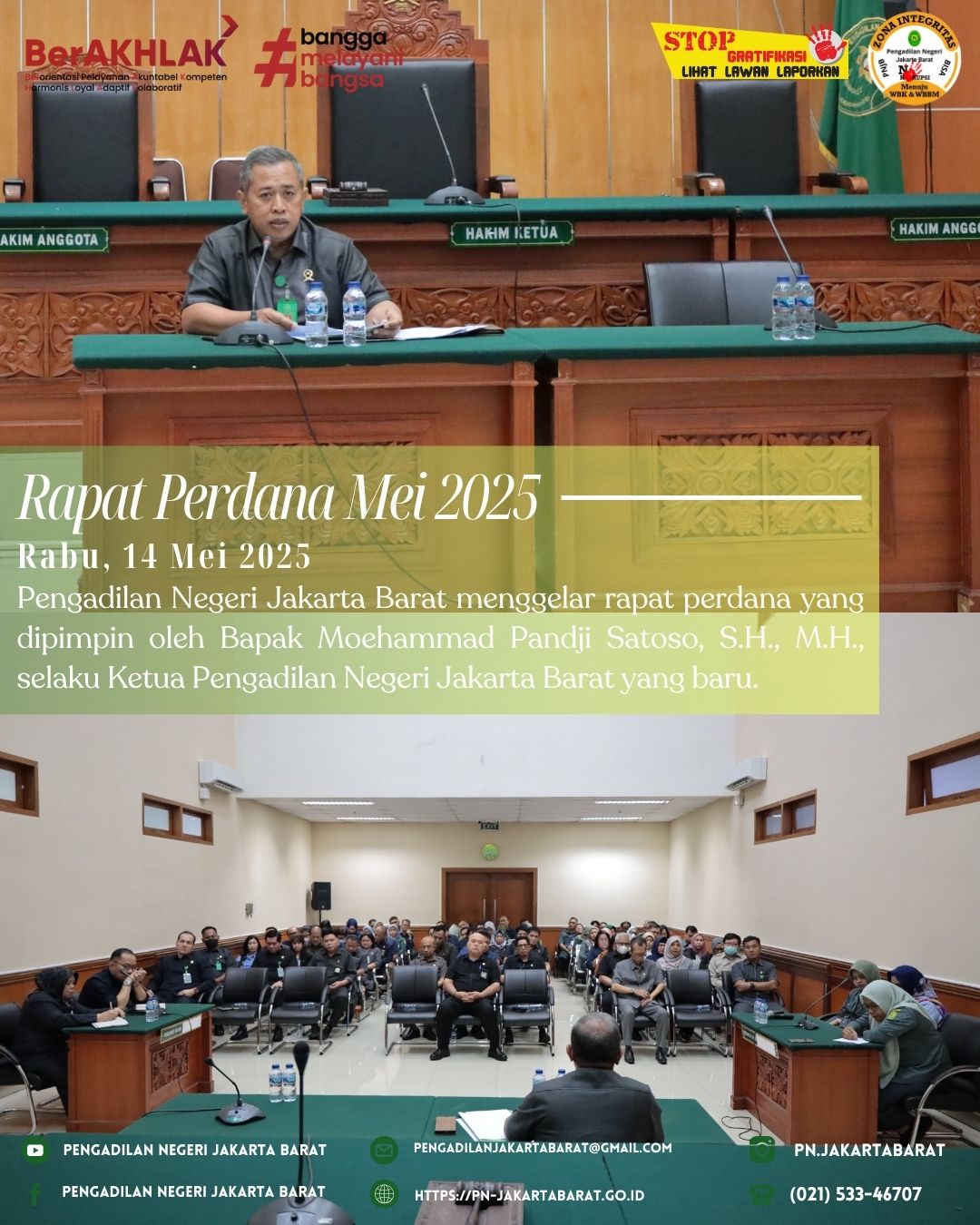 *PNJB, 14 Mei 2025* - Pengadilan Negeri Jakarta Barat menggelar rapat perdana yang dipimpin oleh Bapak Moehammad Pandji Satoso, S.H., M.H., selaku Ketua Pengadilan Negeri Jakarta Barat yang baru.