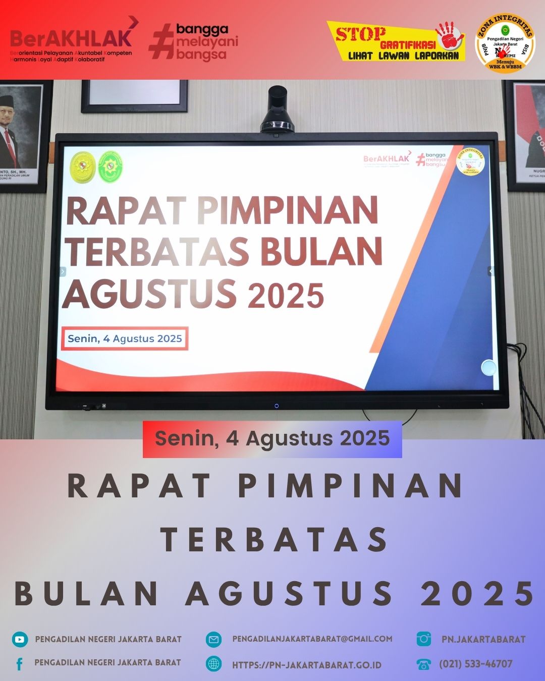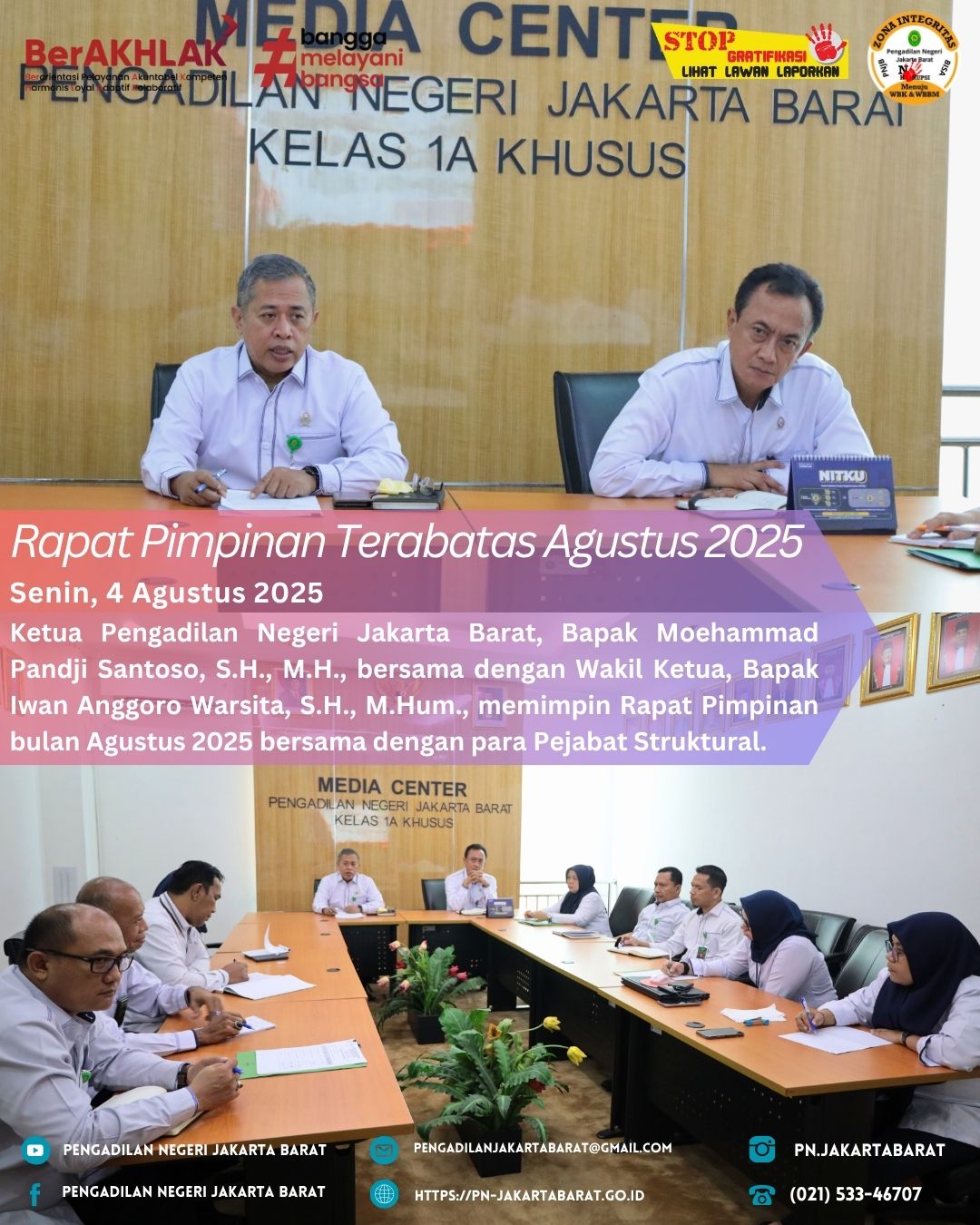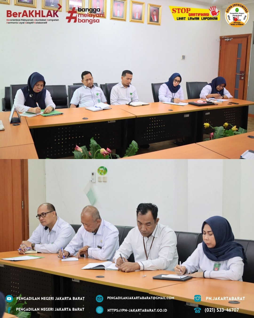 Rapat pimpinan terbatas dibuka oleh Ketua Pengadilan Negeri Jakarta Barat Kelas IA Khusus, Bapak Moehammad Pandji Santoso, S.H., M.H., bersama Wakil Ketua Pengadilan Negeri Jakarta Barat Kelas IA Khusus, Bapak Iwan Anggoro Warsita, S.H., M.Hum. beserta Panitera, Sekretaris, Kepala Bagian Umum, para Panitera Muda, dan para Kepala Sub Bagian, untuk membahas tentang evaluasi kinerja masing-masing bidang.