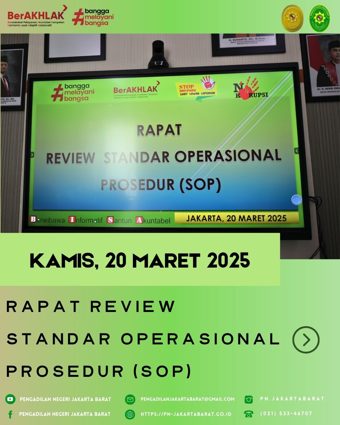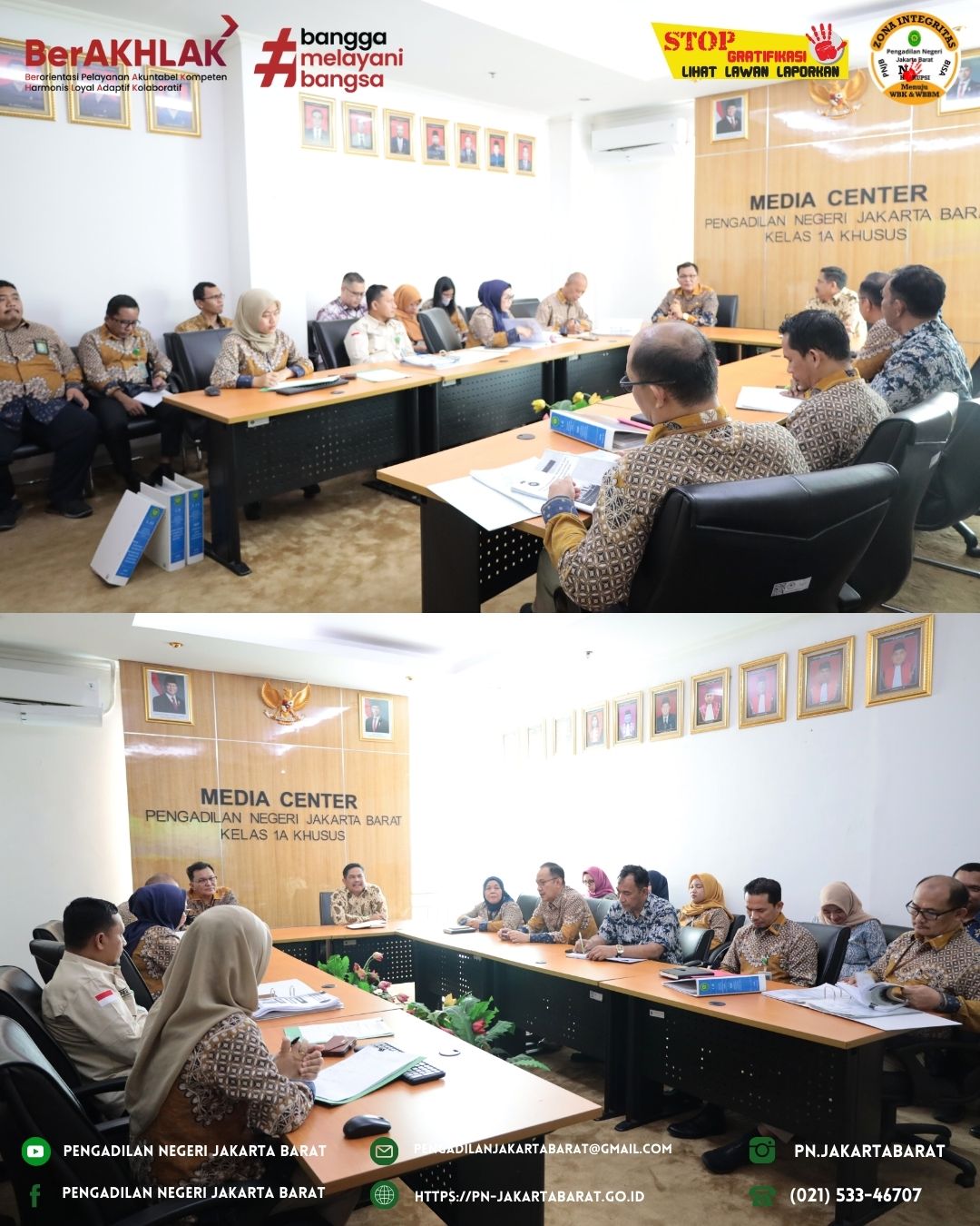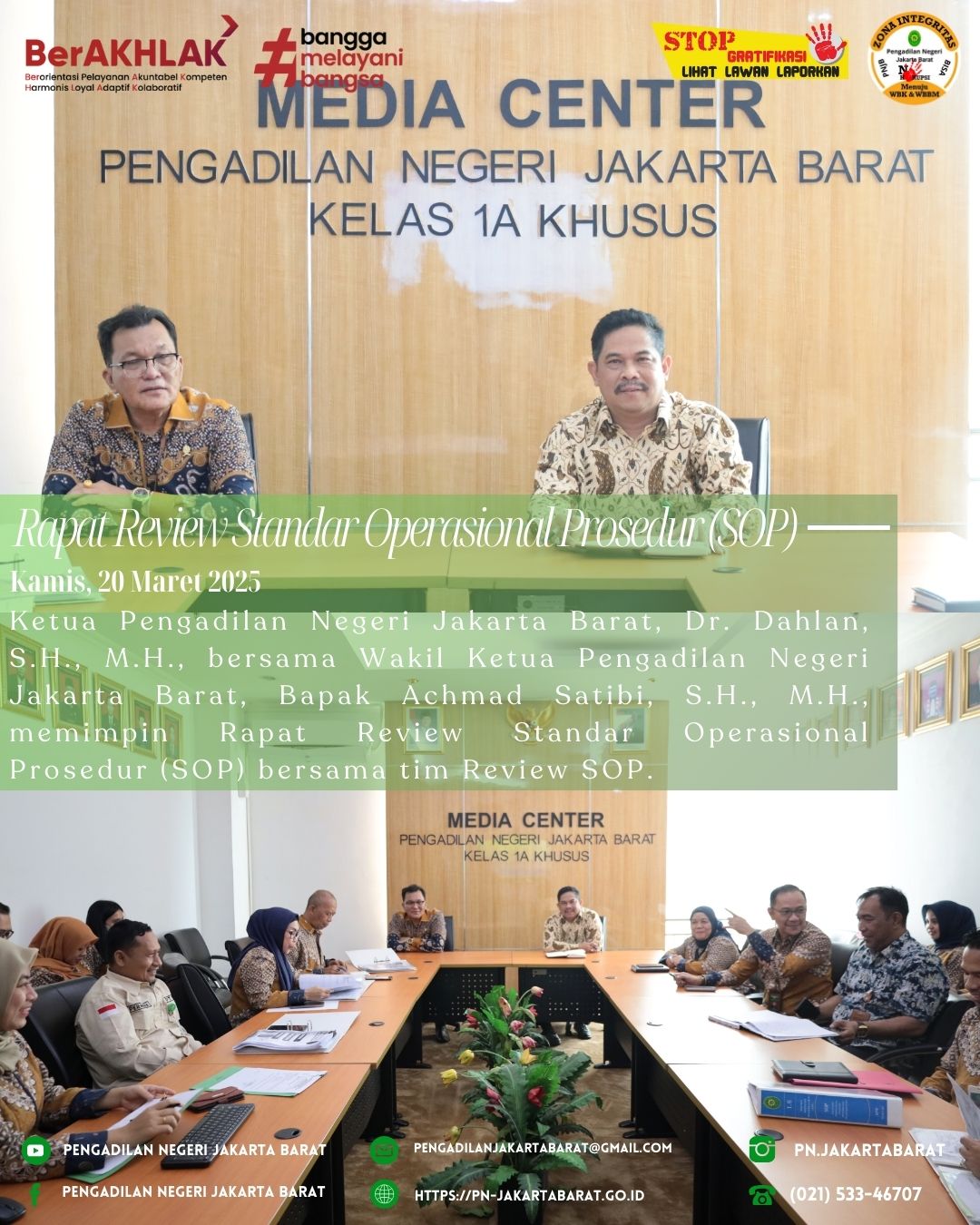 *PNJB, 20 Maret 2025* - Ketua Pengadilan Negeri Jakarta Barat, Dr. Dahlan, S.H., M.H., bersama Wakil Ketua Pengadilan Negeri Jakarta Barat, Bapak Achmad Satibi, S.H., M.H., memimpin Rapat Review Standar Operasional Prosedur (SOP) bersama tim Review SOP dari masing-masing bagian.
