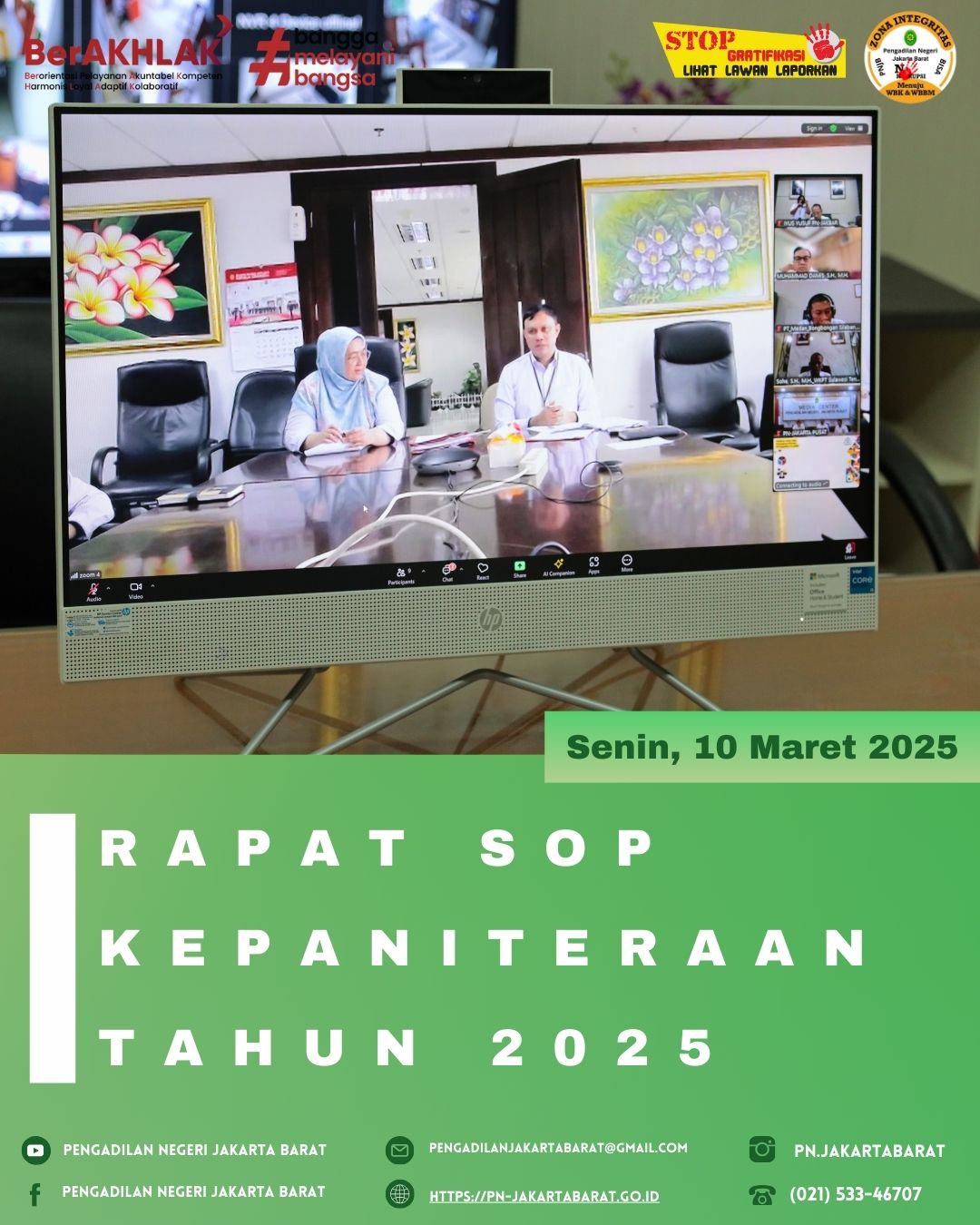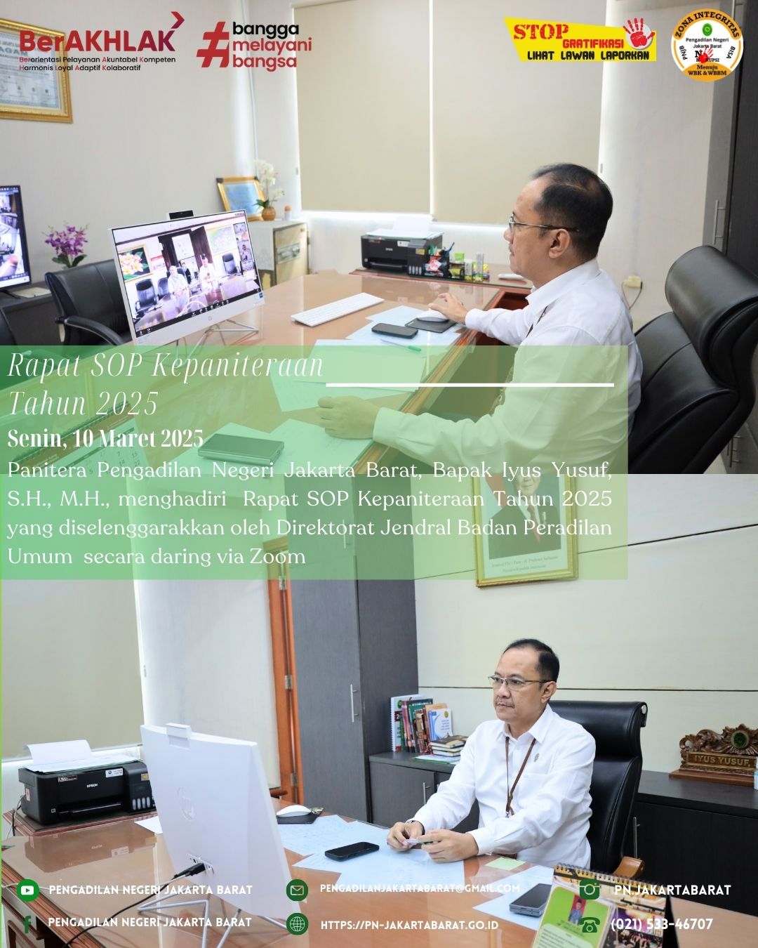 *PNJB, 10 Maret 2025* - Panitera Pengadilan Negeri Jakarta Barat, Bapak Iyus Yusuf, S.H., M.H., menghadiri Rapat SOP Kepaniteraan Tahun 2025 yang diselenggarakkan oleh Direktorat Jendral Badan Peradilan Umum secara daring via Zoom.