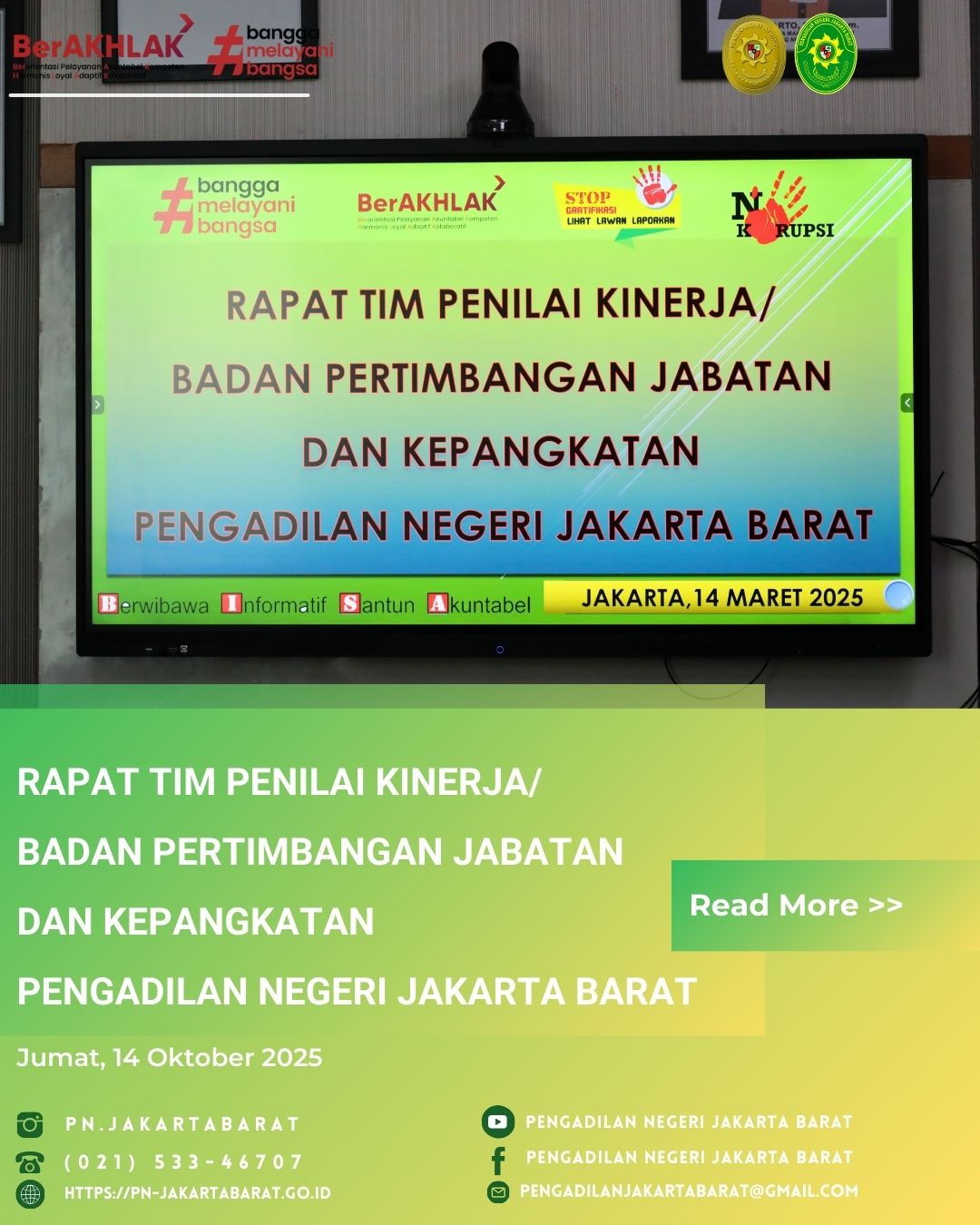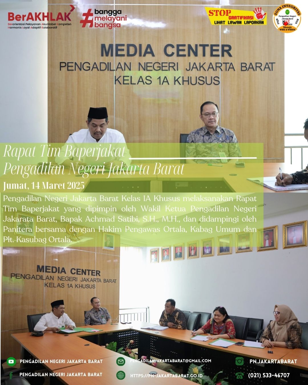 *PNJB, 14 Maret 2025* - Pengadilan Negeri Jakarta Barat Kelas 1A Khusus melaksanakan Rapat Tim Badan Pertimbangan Jabatan dan Kepangkatan yang dipimpin oleh Wakil Ketua Pengadilan Negeri Jakarata Barat, Bapak Achmad Satibi, S.H., M.H., dan didampingi oleh Panitera bersama dengan Hakim Pengawas Ortala, Kabag Umum dan Plt. Kasubag Ortala.