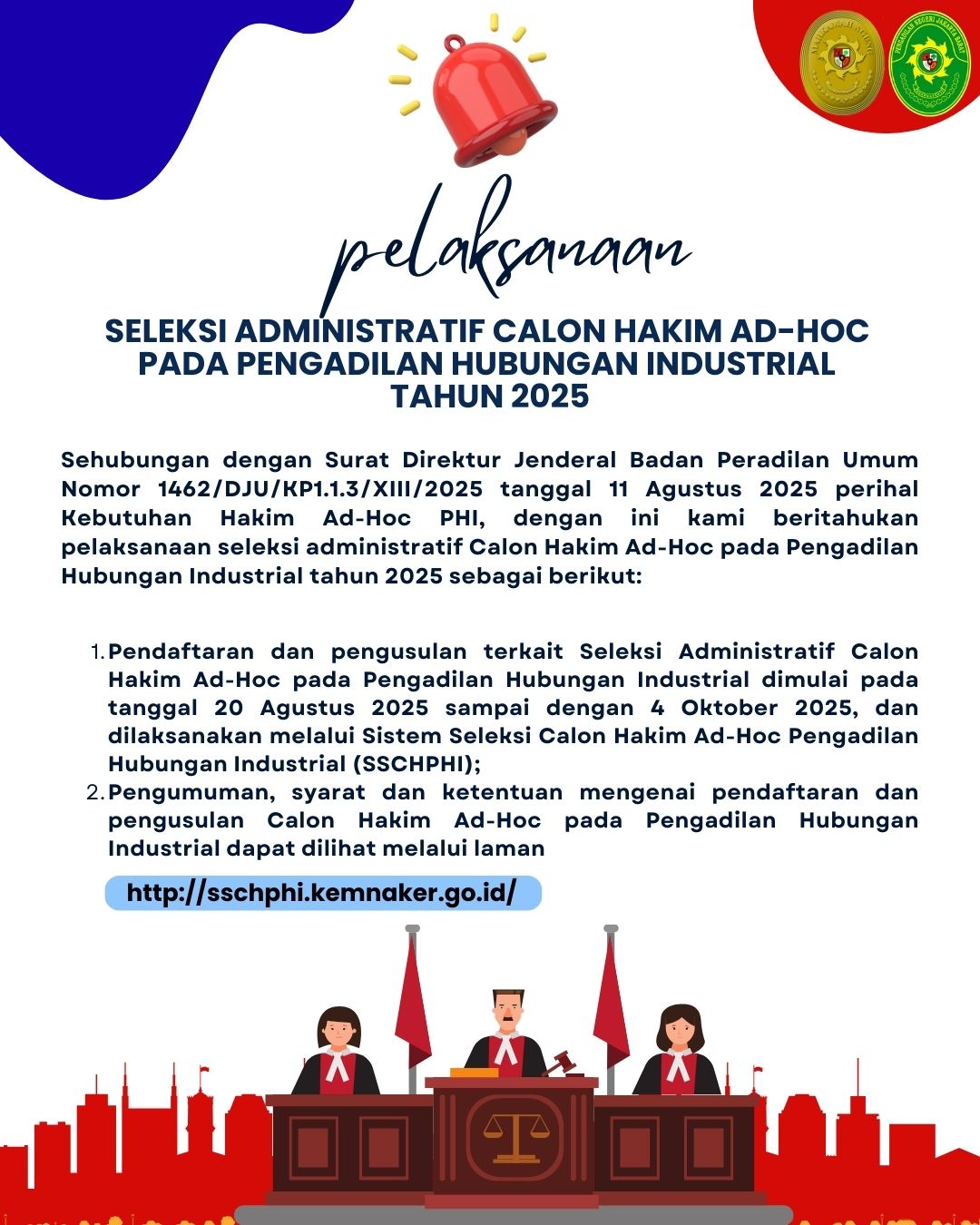 Seleksi administratif Calon Hakim Ad-Hoc pada Pengadilan Hubungan Industrial tahun 2025 telah dibuka!