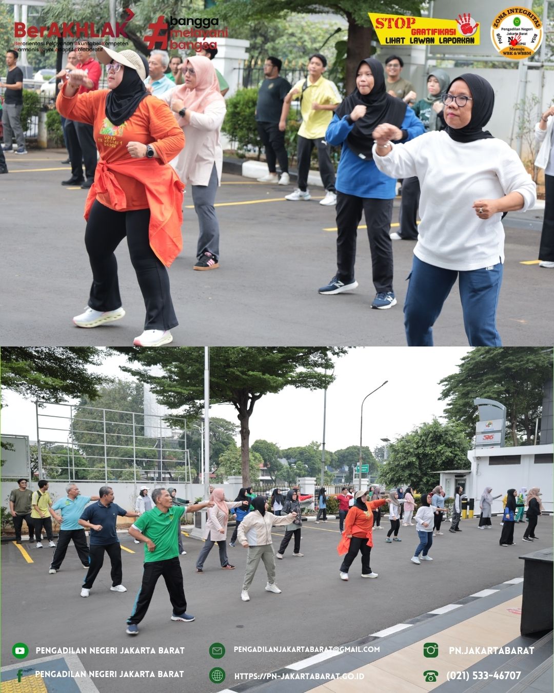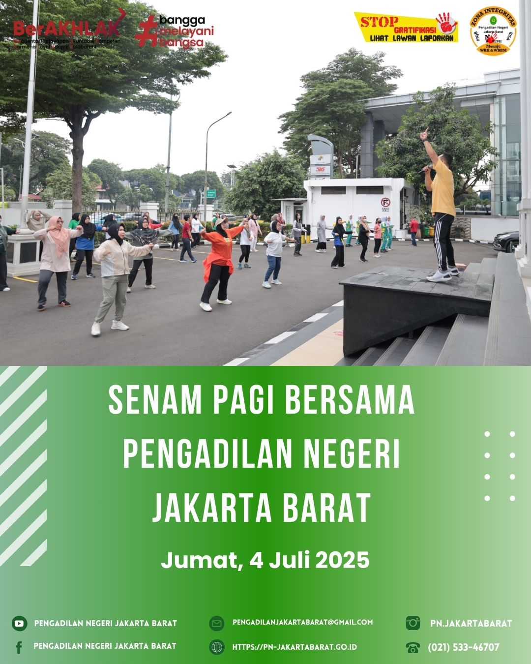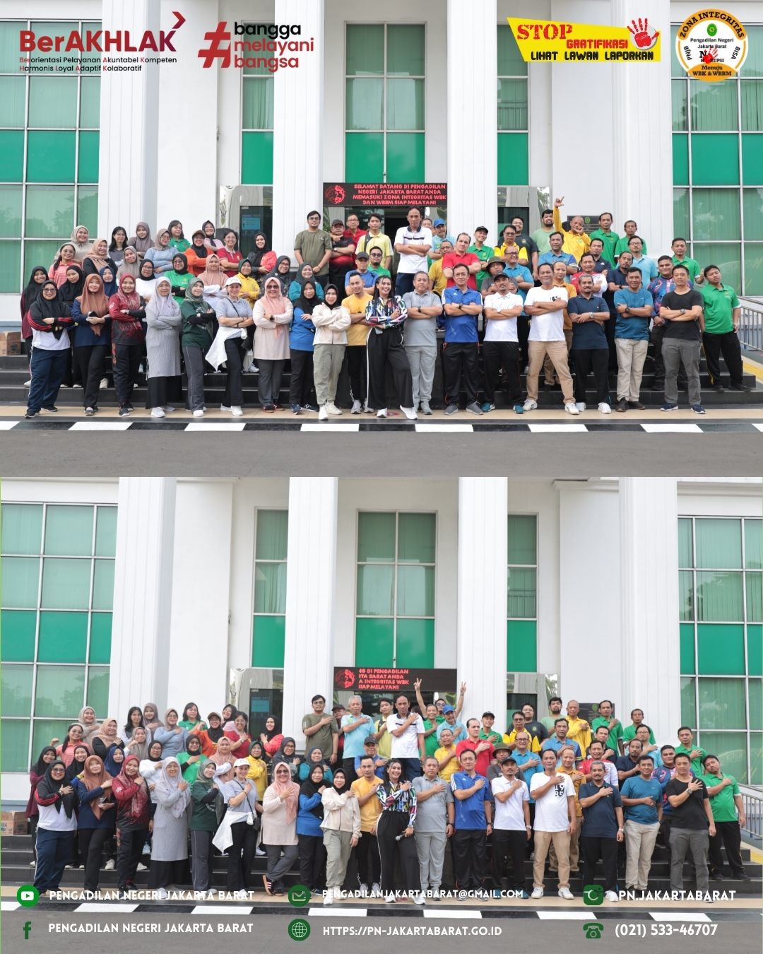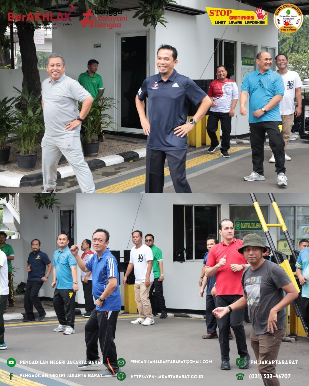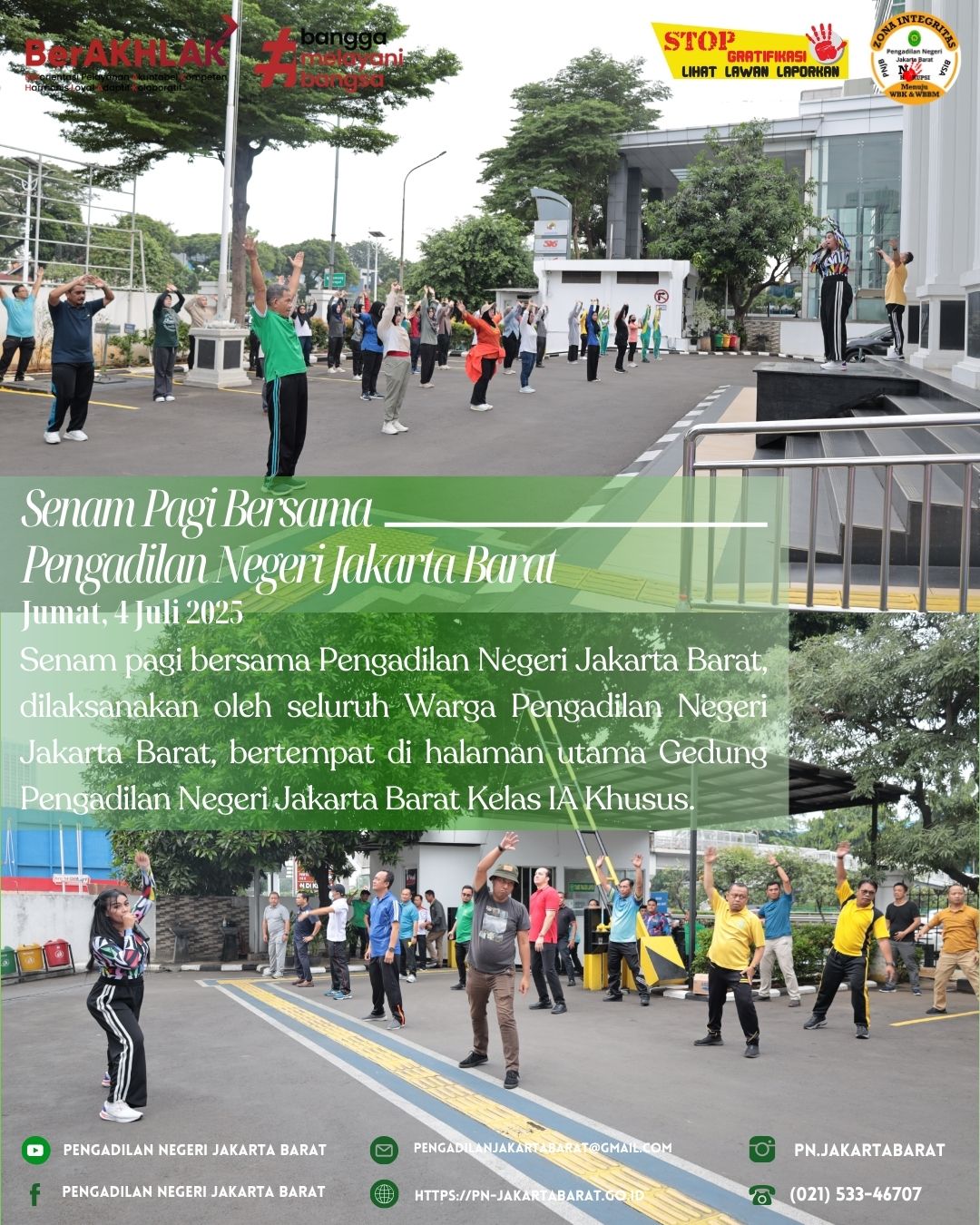 *PNJB, 4 Juli 2025* - Senam pagi bersama Pengadilan Negeri Jakarta Barat, dilaksanakan oleh seluruh Warga Pengadilan Negeri Jakarta Barat, bertempat di halaman utama Gedung Pengadilan Negeri Jakarta Barat Kelas IA Khusus.
