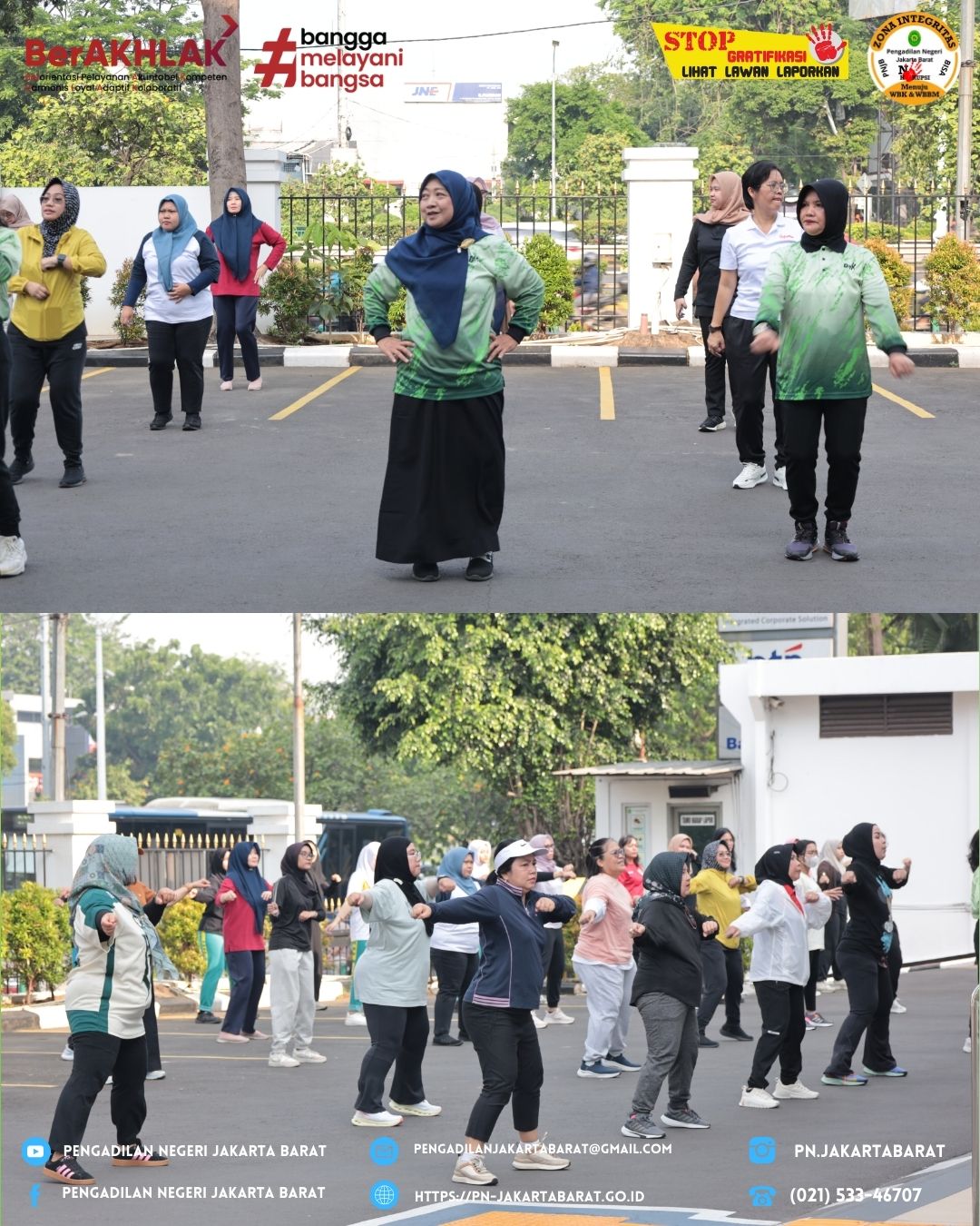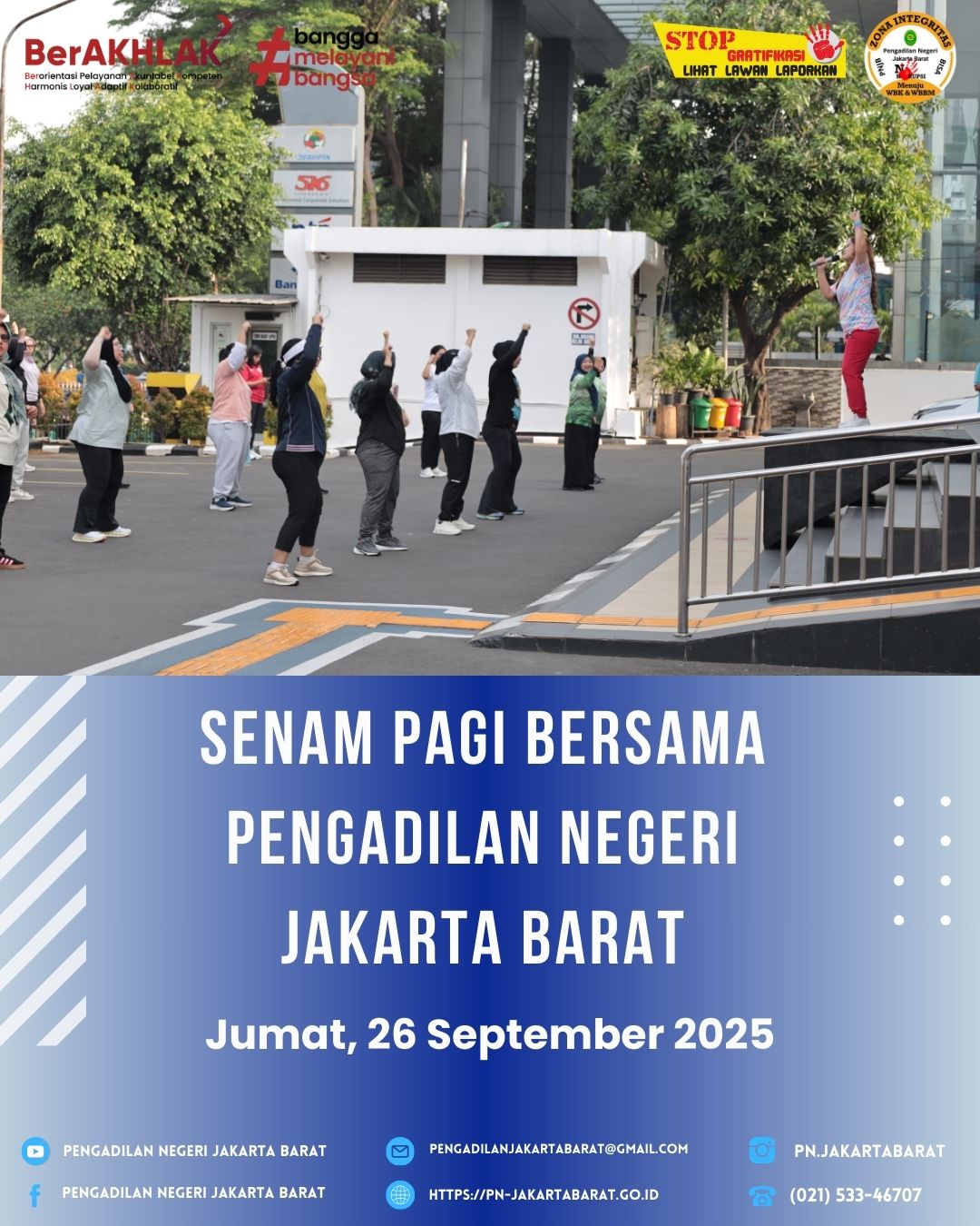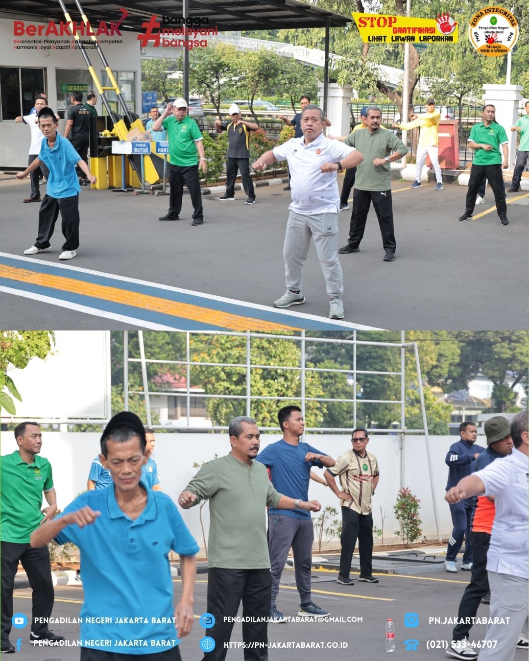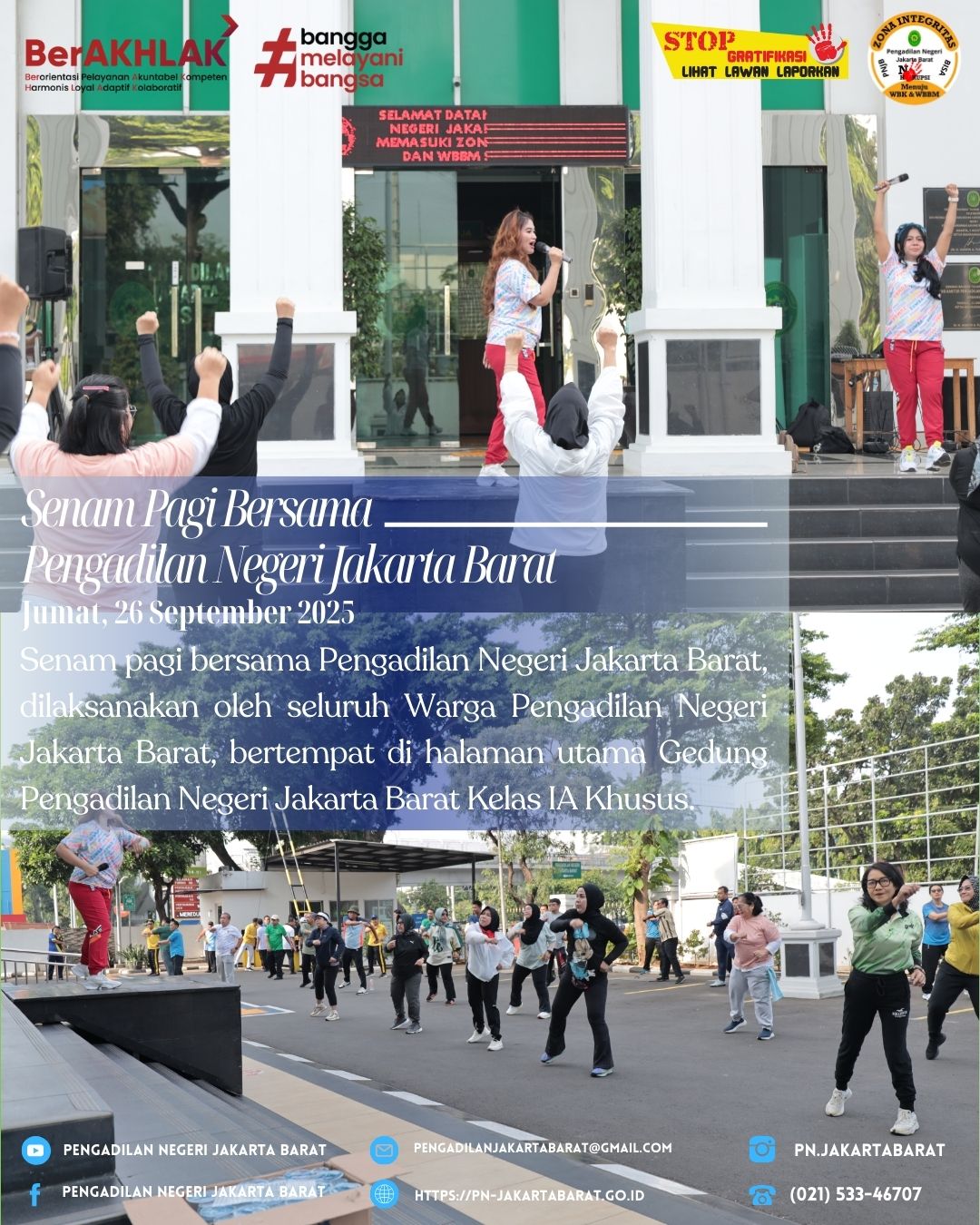 Senam pagi bersama Pengadilan Negeri Jakarta Barat, dilaksanakan oleh seluruh Warga Pengadilan Negeri Jakarta Barat, bertempat di halaman utama Gedung Pengadilan Negeri Jakarta Barat Kelas IA Khusus.