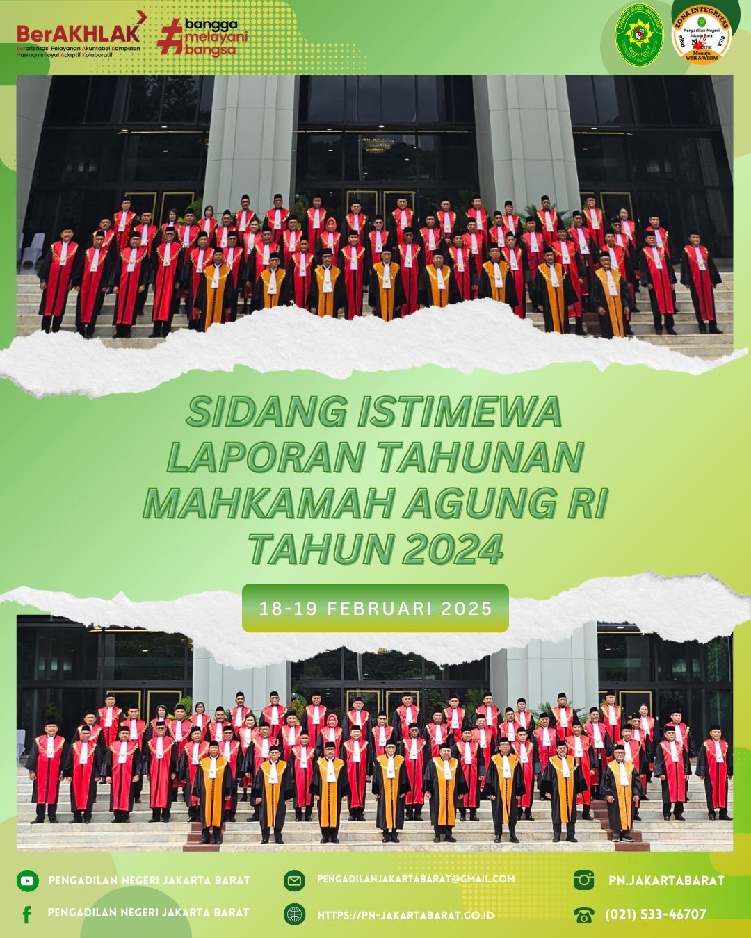 *PNJB, 18- 19 Februari 2025* – Ketua Pengadilan Negeri Jakarta Barat, Bapak Dr. Dahlan, S.H., M.H., menghadiri Sidang Istimewa Laporan Tahunan Mahkamah Agung Republik Indonesia Tahun 2024 yang diselenggarakan di Gedung Mahkamah Agung RI, Jakarta.