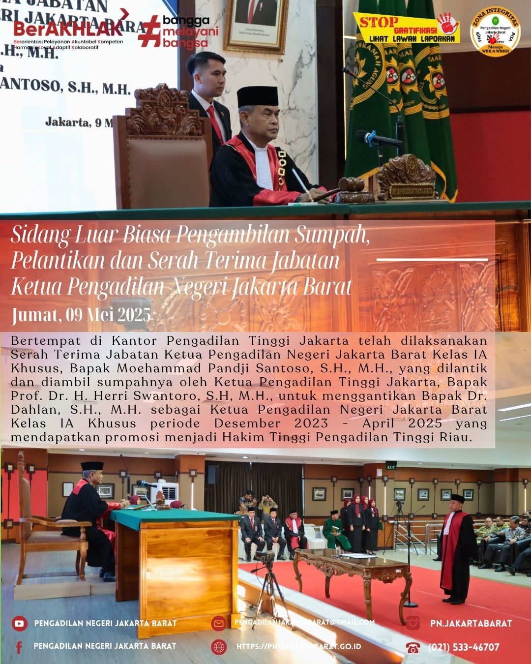 *PNJB, 09 Mei 2025* - Bertempat di Kantor Pengadilan Tinggi Jakarta telah dilaksanakan Serah Terima Jabatan Ketua Pengadilan Negeri Jakarta Barat Kelas IA Khusus, Bapak Moehammad Pandji Santoso, S.H., M.H., dilantik dan diambil sumpahnya oleh Ketua Pengadilan Tinggi Jakarta, Bapak Prof. Dr. H. Herri Swantoro, S.H, M.Η., untuk menggantikan Bapak Dr. Dahlan, S.H., M.H. sebagai Ketua Pengadilan Negeri Jakarta Barat Kelas IA Khusus periode Desember 2023 - Mei 2025 yang mendapatkan promosi menjadi Hakim Tinggi Pengadilan Tinggi Riau.