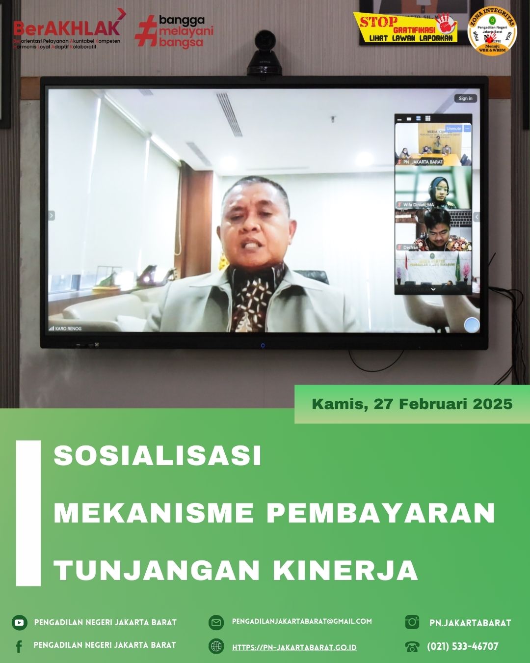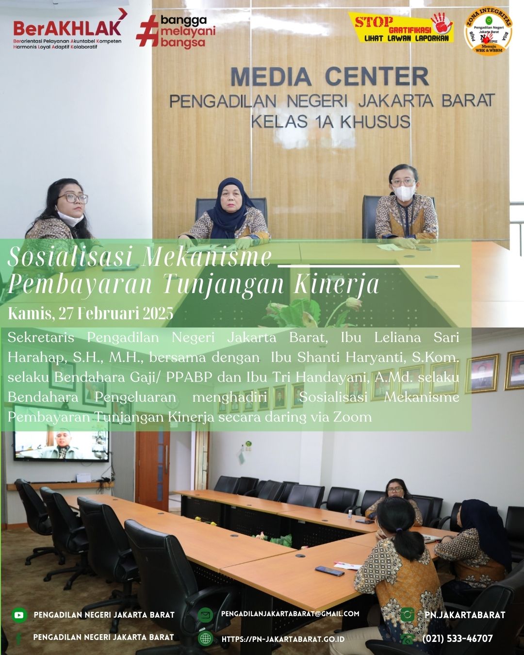 *PNJB, 27 Februari 2025* - Sekretaris Pengadilan Negeri Jakarta Barat, Ibu Leliana Sari Harahap, S.H., M.H., bersama dengan Ibu Shanti Haryanti, S.Kom. selaku Bendahara Gaji/ PPABP dan Ibu Tri Handayani, A.Md. selaku Bendahara Pengeluaran menghadiri Sosialisasi Mekanisme Pembayaran Tunjangan Kinerja yang diselenggarakan Biro Perencanaan dan Organisasi Mahkamah Agung secara daring via Zoom.