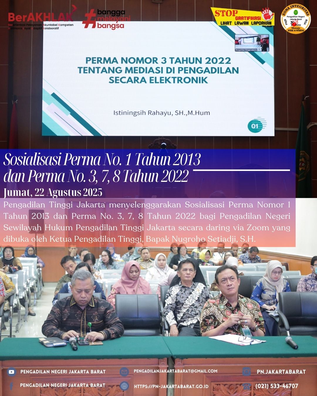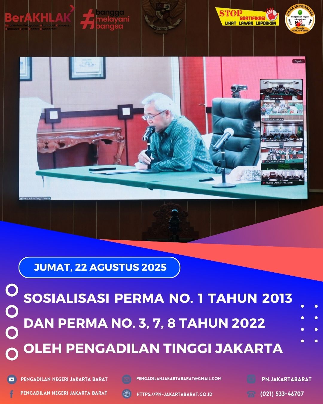 Pengadilan Tinggi Jakarta menyelenggarakan Sosialisasi Perma Nomor 1 Tahun 2013 dan Perma No. 3, 7, 8 Tahun 2022 bagi Pengadilan Negeri Sewilayah Hukum Pengadilan Tinggi Jakarta secara daring via Zoom yang dibuka oleh Ketua Pengadilan Tinggi, Bapak Nugroho Setiadji, S.H.