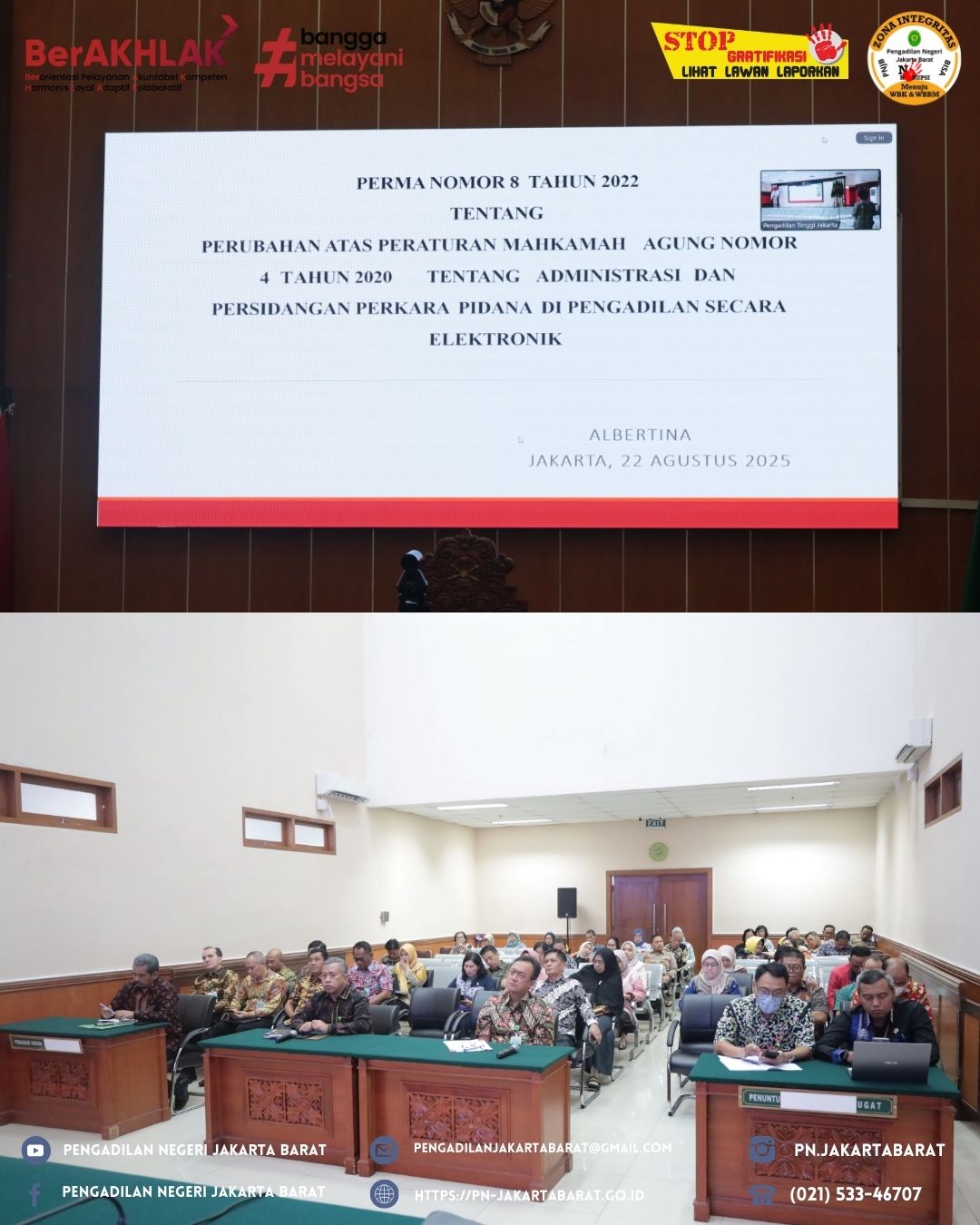 Terakhir terdapat Sosialisasi Persidangan Elektronik Pidana sesuai PERMA 8 Tahun 2022 dan SK KMA 365/SK/KMA/XII/2022 tentang Petunjuk Teknis Administrasi Dan Persidangan Perkara Pidana Di Pengadilan Secara Elektronik oleh Ibu Albertina Ho Wakil Ketua Pengadilan Tinggi Jakarta.