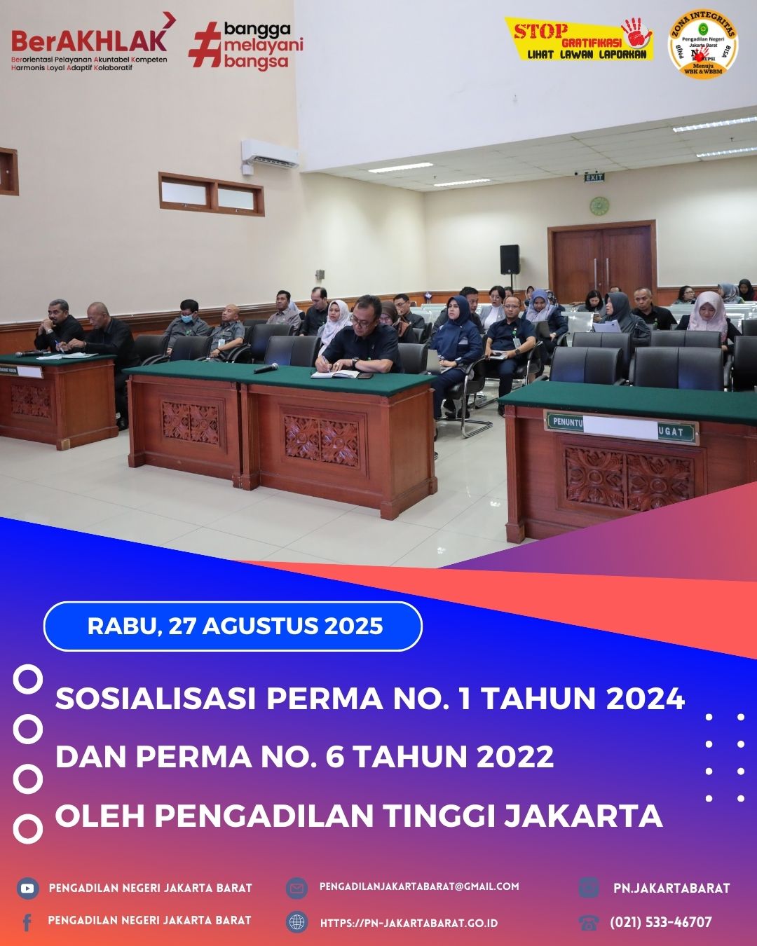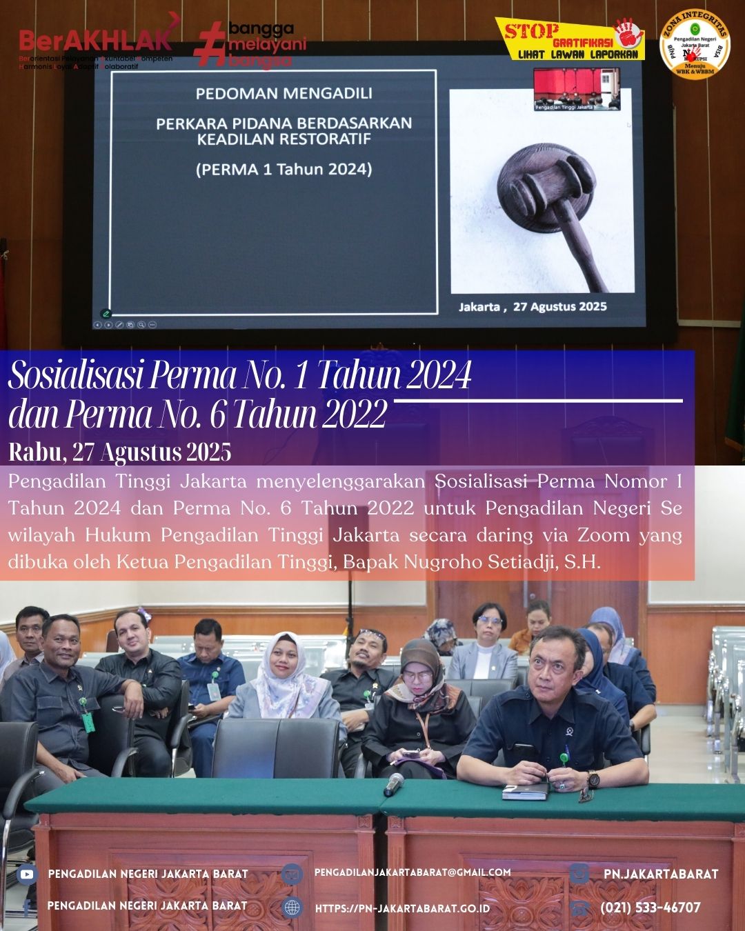 Pengadilan Tinggi Jakarta menyelenggarakan Sosialisasi Perma No. 1 Tahun 2024 & Perma No. 6 Tahun 2022 untuk Pengadilan Negeri Sewilayah Hukum Pengadilan Tinggi Jakarta secara daring via Zoom yang dibuka oleh Ketua Pengadilan Tinggi, Bapak Nugroho Setiadji, S.H.