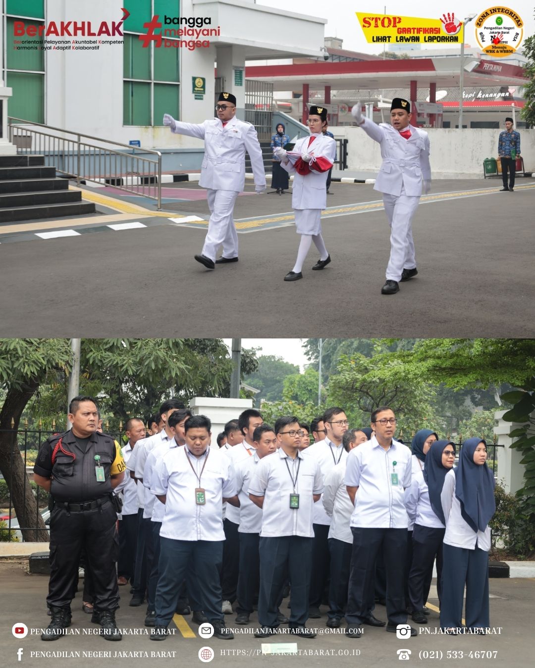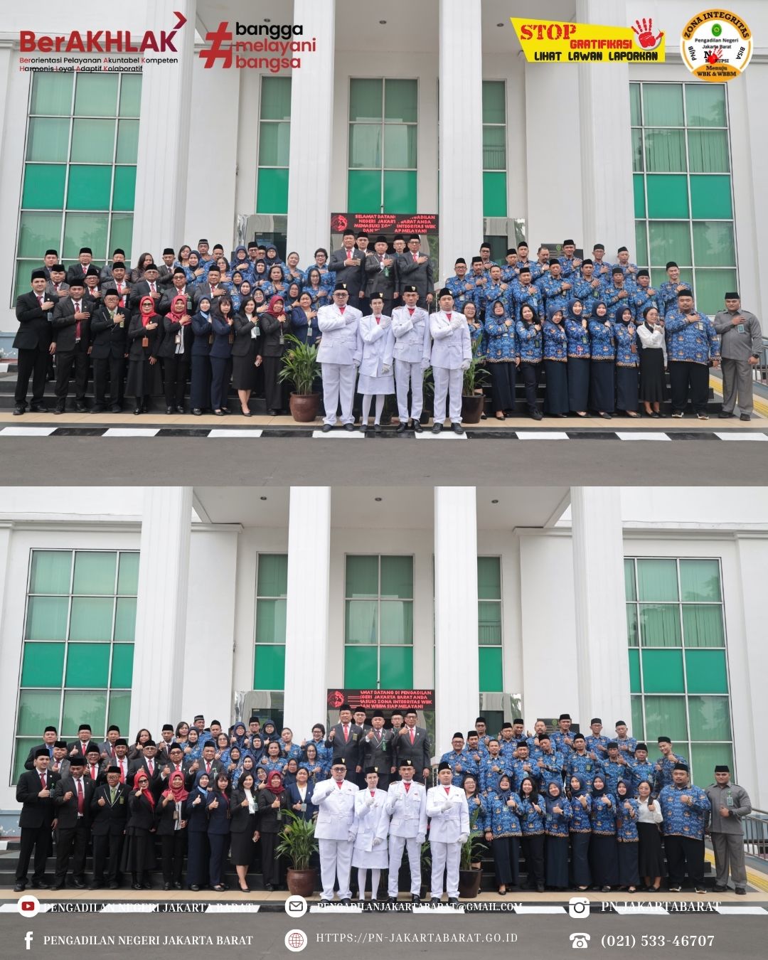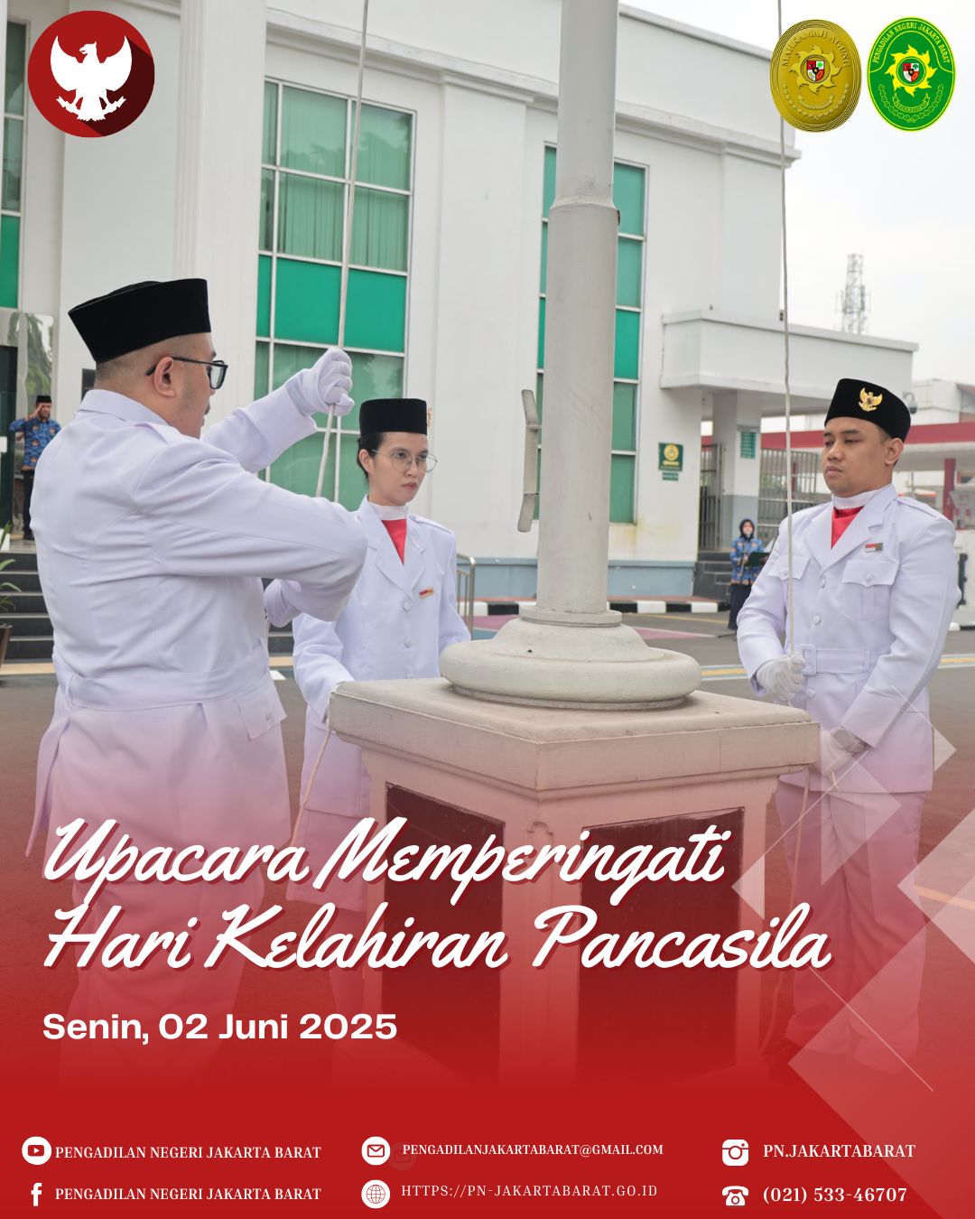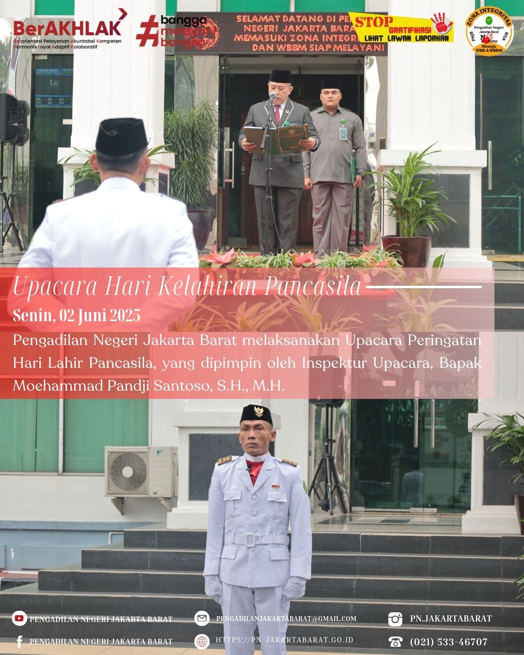 *PNJB, 02 Juni 2025* - Pengadilan Negeri Jakarta Barat Kelas IA Khusus melaksanakan Upacara Memperingati Hari Lahir Pancasila Tahun 2025. Upacara dipimpin oleh Ketua Pengadilan Negeri Jakarta Barat Kelas IA Khusus, Bapak Moehammad Pandji Santoso, S.H., M.H., sebagai Inspektur Upacara, selaku Perwira Upacara, Bapak Wasino, S.H., M.H., Ajudan, Bapak Tri Ana Juliva, Komandan Upacara, Bapak Andry Hidayat, Pemandu Acara (MC) Ibu Elfri Annisa Ivaramulya, S.Hum., Petugas pengibar bendera adalah, Bapak Indriansyah, S.H., Ibu Oktarina Permatasari, A.Md.A.B., Bapak Deden Kusdinar, S.H., Pembaca Pembukaan UUD 1945, Bapak Miftah Farid, A.Md., serta Pembaca Doa oleh Bapak Muchamad Irwan Arsyansyah, S.Sos.