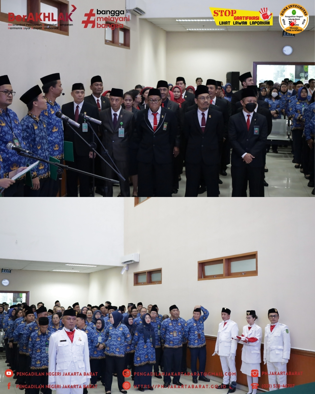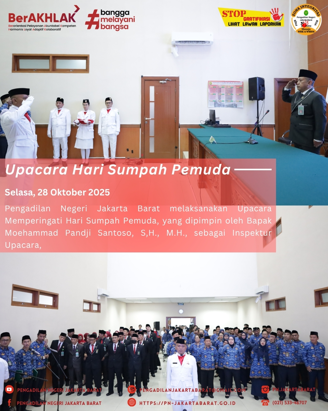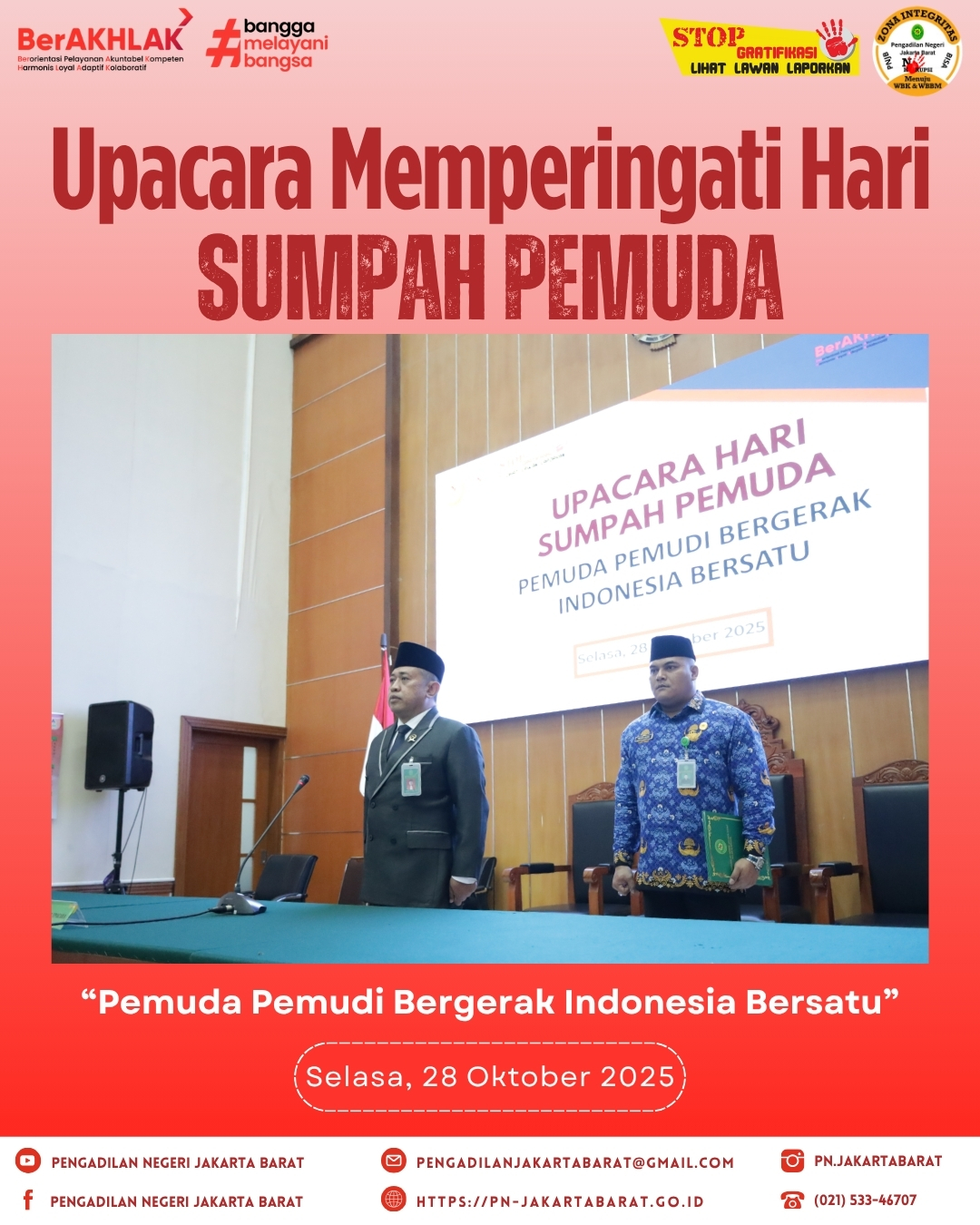 Jakarta, 28 Oktober 2025 - Pengadilan Negeri Jakarta Barat Kelas 1A Khusus melaksanakan Upacara Memperingati Hari Sumpah Pemuda tahun 2025. Upacara di pimpin oleh Ketua Pengadilan Negeri Jakarata Barat, Bapak Moehammad Pandji Santoso, S,H., M.H., sebagai Inspektur Upacara, didampingi oleh Bapak Wasino, S.H., M.H., sebagai Perwira Upacara, Bapak Tri Ana Juliva sebagai Ajudan Upacara, Bapak Mudiono, sebagai Komandan Upacara, Ibu Nada Lestari Sihombing, S.H, sebagai Pemandu Acara (MC),