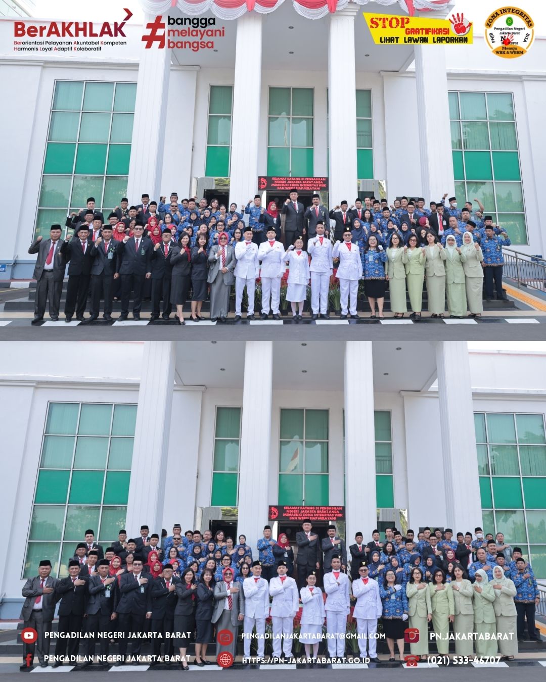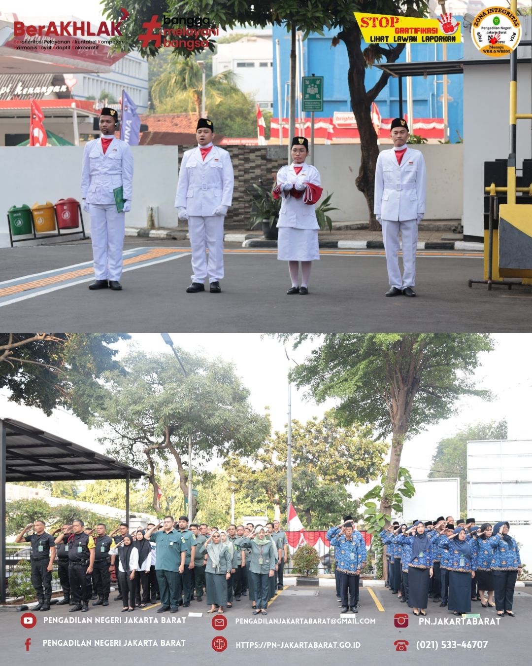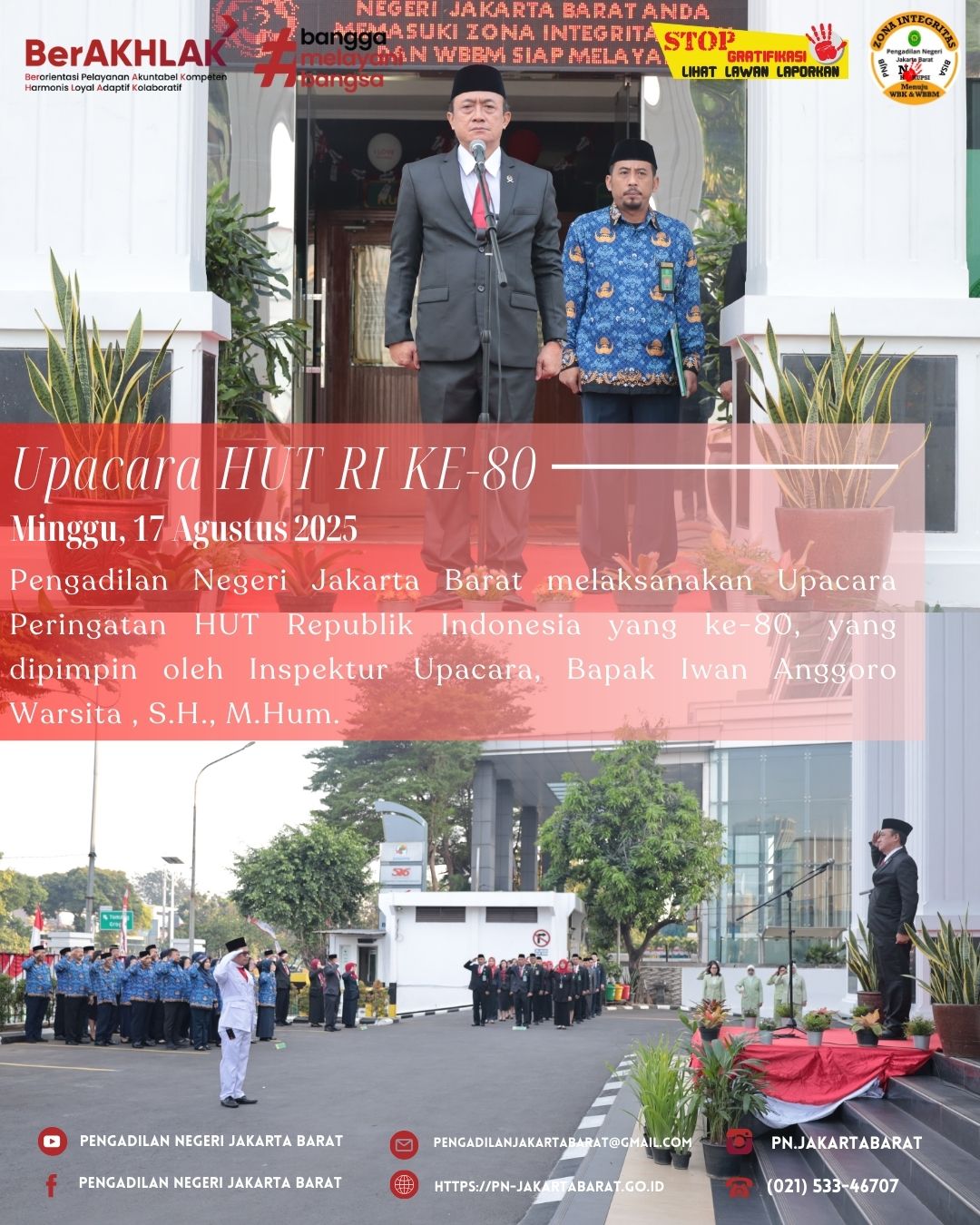 Pengadilan Negeri Jakarta Barat Kelas IA Khusus melaksanakan Upacara Memperingati HUT Republik Indonesia ke-80. Upacara di pimpin oleh Wakil Ketua Pengadilan Negeri Jakarta Barat, Bapak Iwan Anggoro Warsita, S.H., M.Hum., sebagai Inspektur Upacara, didampingi oleh Pembaca Naskah Proklamasi, Bapak Aslan Ainin, S.H., M.H., Ajudan, Ade Rosadi, S.H., Komandan Upacara, Bapak Mangaranap Simamora, S.H., M.H., Pemandu Acara (MC) Ibu Shanti Haryanti, S.Kom., Petugas pengibar bendera adalah, Bapak Deden Kusdinar, S.H., Ibu Nada Lestari Sihombing, S.H., Bapak Miftah Farid, A.Md., Pembacaan pembukaan UUD 1945 oleh Bapak Asa Septian Adi, S.H., serta pembacaan doa oleh Bapak Mohamad Sayuti Beroeh, S.Kom.