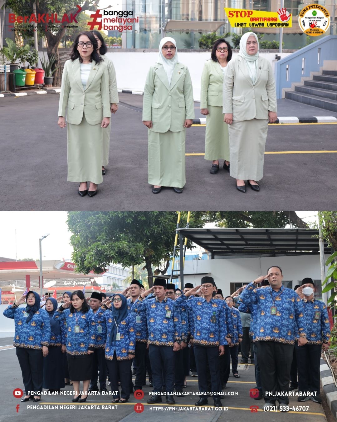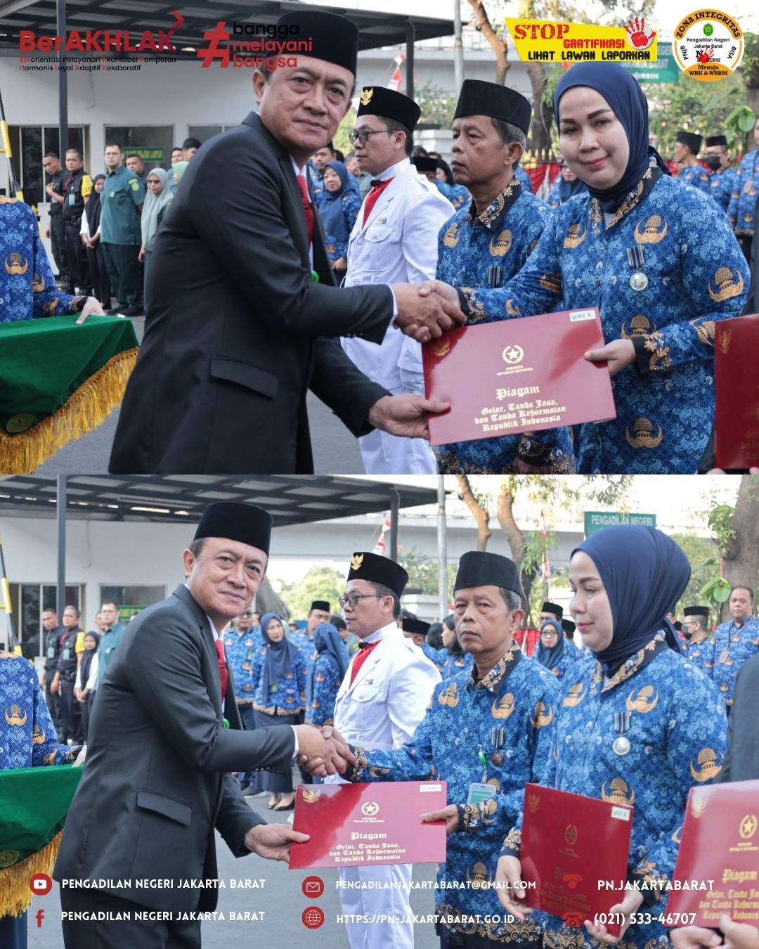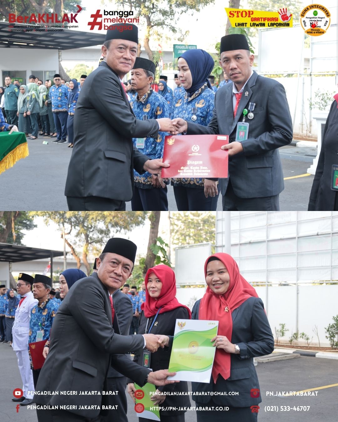 Pengadilan Negeri Jakarta Barat Kelas IA Khusus melaksanakan Upacara Memperingati HUT Republik Indonesia ke-80. Upacara di pimpin oleh Wakil Ketua Pengadilan Negeri Jakarta Barat, Bapak Iwan Anggoro Warsita, S.H., M.Hum., sebagai Inspektur Upacara, didampingi oleh Pembaca Naskah Proklamasi, Bapak Aslan Ainin, S.H., M.H., Ajudan, Ade Rosadi, S.H., Komandan Upacara, Bapak Mangaranap Simamora, S.H., M.H., Pemandu Acara (MC) Ibu Shanti Haryanti, S.Kom., Petugas pengibar bendera adalah, Bapak Deden Kusdinar, S.H., Ibu Nada Lestari Sihombing, S.H., Bapak Miftah Farid, A.Md., Pembacaan pembukaan UUD 1945 oleh Bapak Asa Septian Adi, S.H., serta pembacaan doa oleh Bapak Mohamad Sayuti Beroeh, S.Kom.