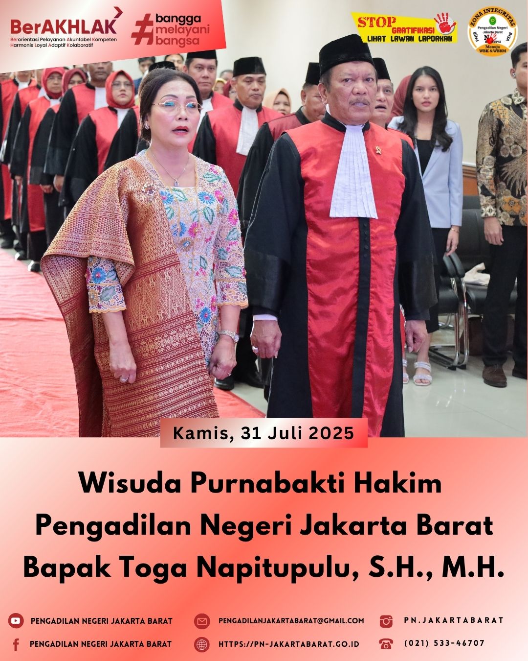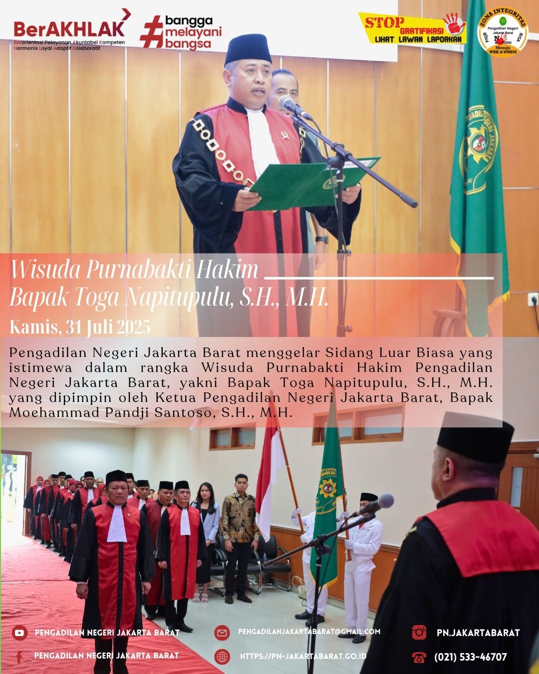 Pengadilan Negeri Jakarta Barat menggelar Sidang Luar Biasa yang istimewa dalam rangka Wisuda Purnabakti Hakim Pengadilan Negeri Jakarta Barat, yakni Bapak Toga Napitupulu, S.H., M.H. Acara bersejarah ini berlangsung di Ruang Sidang Kusuma Atmaja Pengadilan Negeri Jakarta Barat, yang juga dihadiri oleh seluruh Anggota IKAHI pada Pengadilan Negeri Jakarta Barat.
