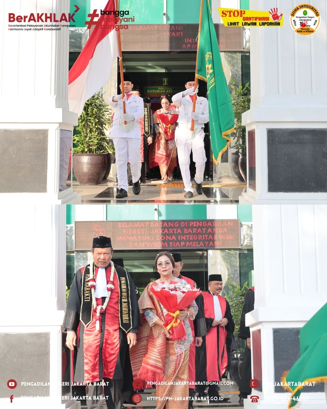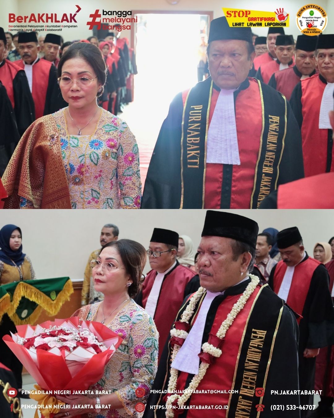Pada acara tersebut, terlihat momen yang sarat makna, yaitu pengalungan bunga serta penyerahan plakat cinderamata dan buket bunga oleh Ketua dan Wakil Ketua Pengadilan Negeri Jakarta Barat kepada Bapak Toga Napitupulu, S.H., M. H. dan istri. Momen ini merupakan simbol tanda purna tugas dan penghargaan yang tinggi terhadap jasa dan kontribusi besar yang telah diberikan oleh Bapak Toga Napitupulu, S.H., M. H. selama mengabdi sebagai seorang hakim.